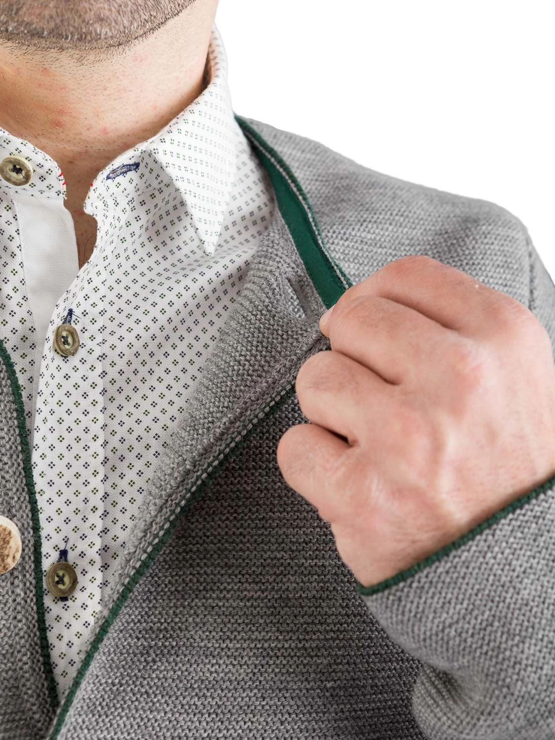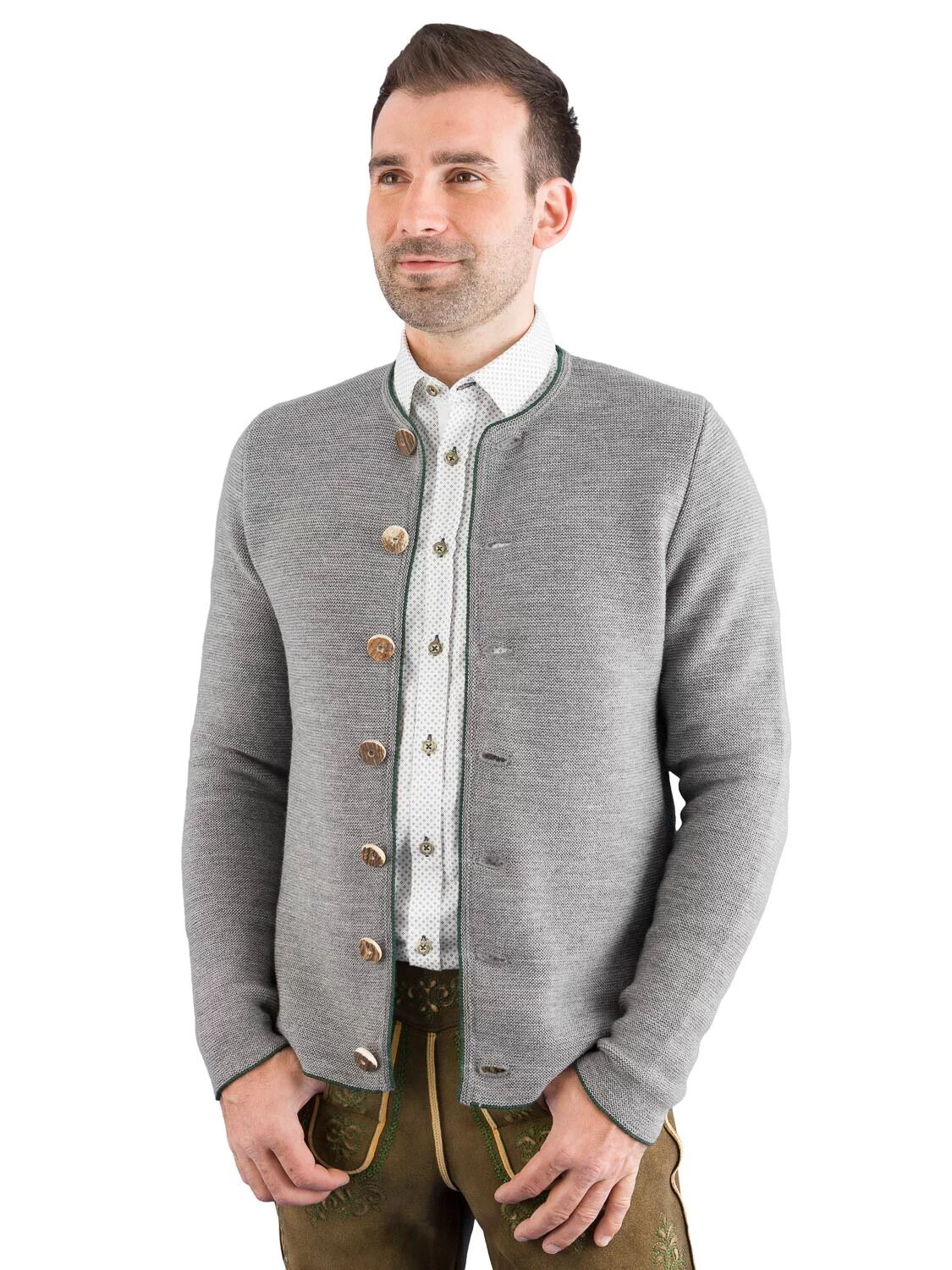 Hochwertige Strickjacke Aloisius kiesel/tanne der Marke Gottseidank. Die Trachtenjacke wird in Deutschland gefertigt. Sie ist aus 100 % feiner Schurwolle. Sie hat eine schmale Paßforn und ist mit echten Hirschhornknöpfen ausgestattet.