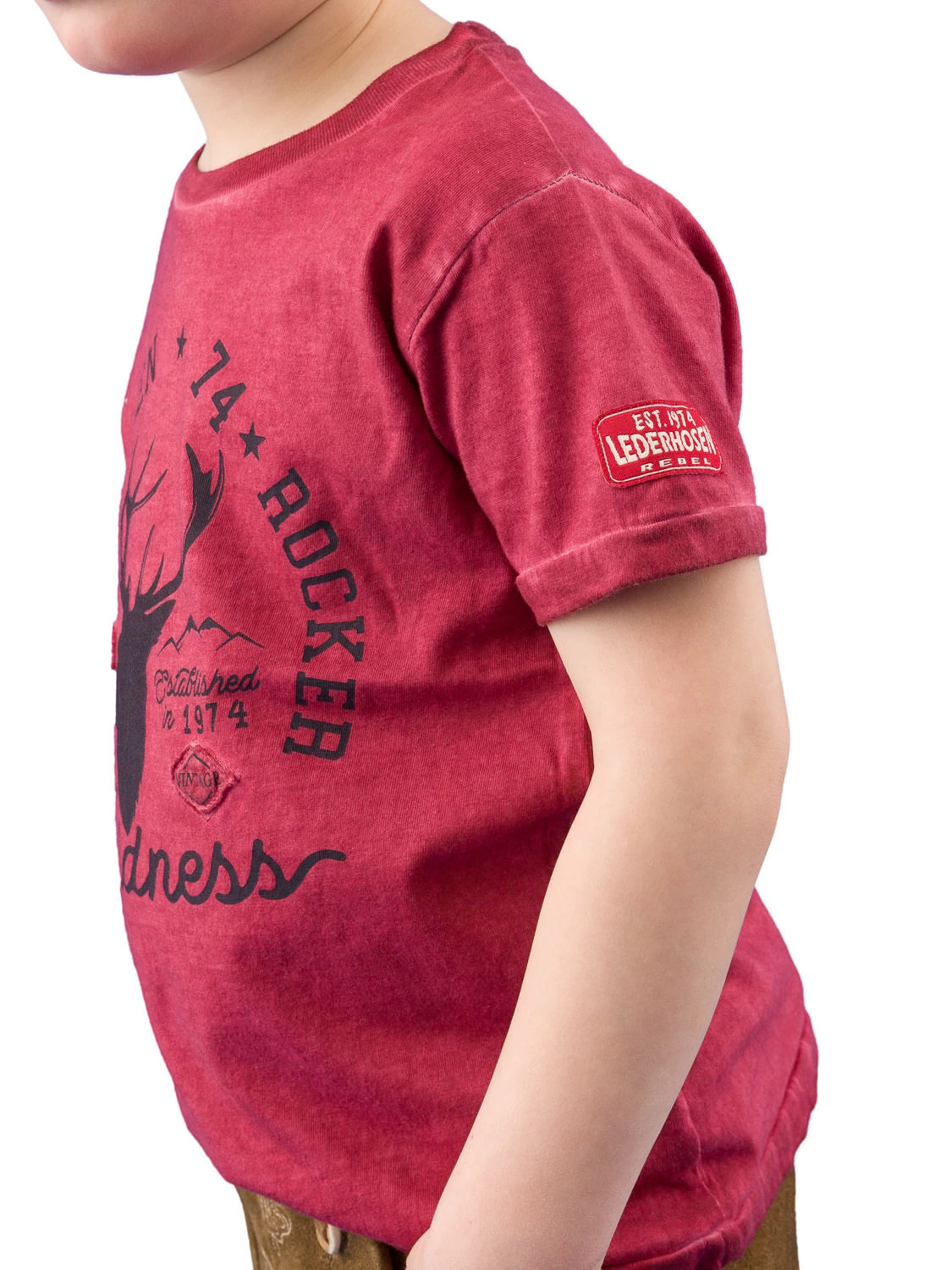 Trachten T-Shirt 29941 rot aus der Serie Lederhosen Rebel der Marke Bondi. Das Shirt in gewaschener Used Optik besticht mit den frechen Aufdruck.