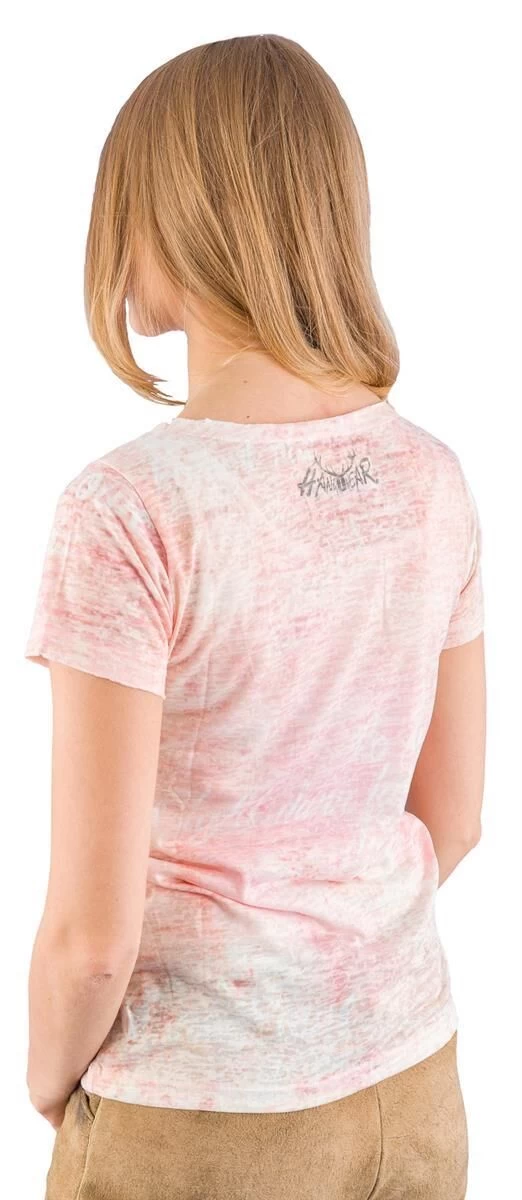 Trachten T-Shirt Daniela apricot der Marke Hangowear. Das Shirt ist vorne mit einem braunen Hirsch bedruckt und mit Strasssteinen verziert. Halsausschnitt und Ärmelabschluss sind mit offenen Kanten versehen. Im Nackenbereich befindet sich der Markenaufdruck von Hangowear.