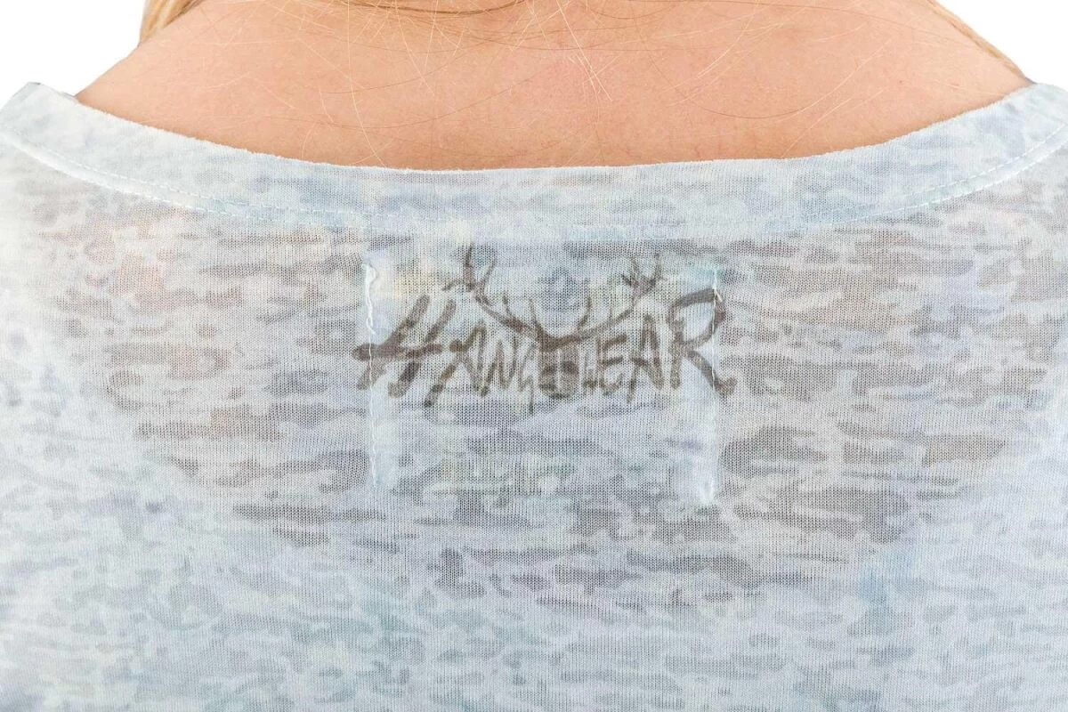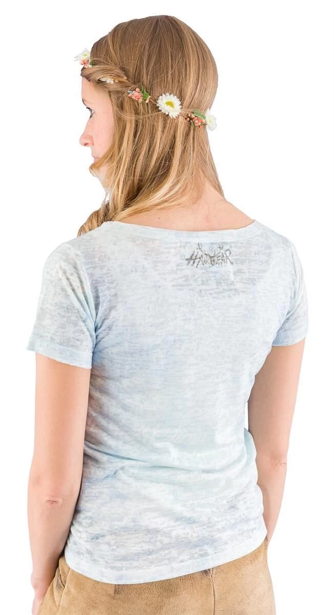 Trachten T-Shirt Daniela hellblau der Marke Hangowear. Das Trachtenshirt hat am Ausschnitt und Ärmelabschluss offene Kanten. Das Vorderteil ist mit einem blauen Hirschen bedruckt, der mit kristallenen Strasssteinen verziert ist. Das T-Shirt ist sehr schmal geschnitten, wird aber auch sehr schmal getragen. Der Baumwollstoff ist sehr leicht und angenehm zu tragen.