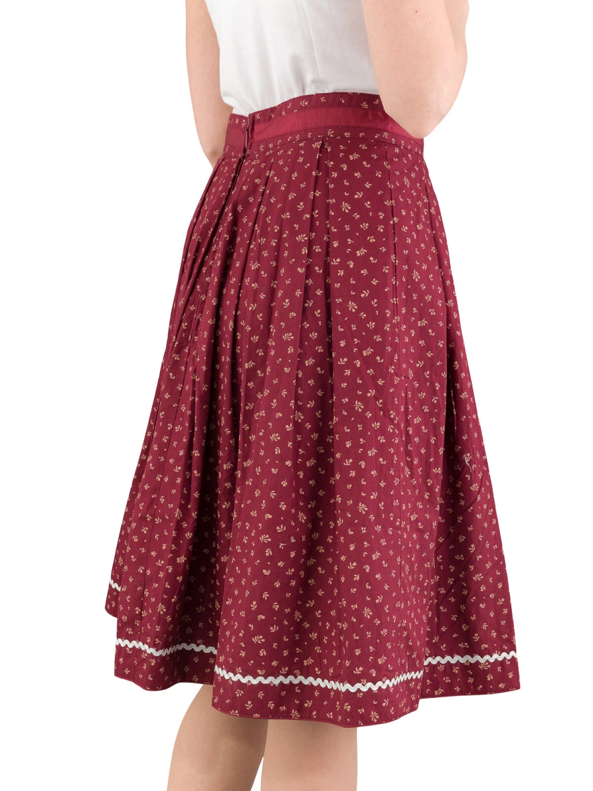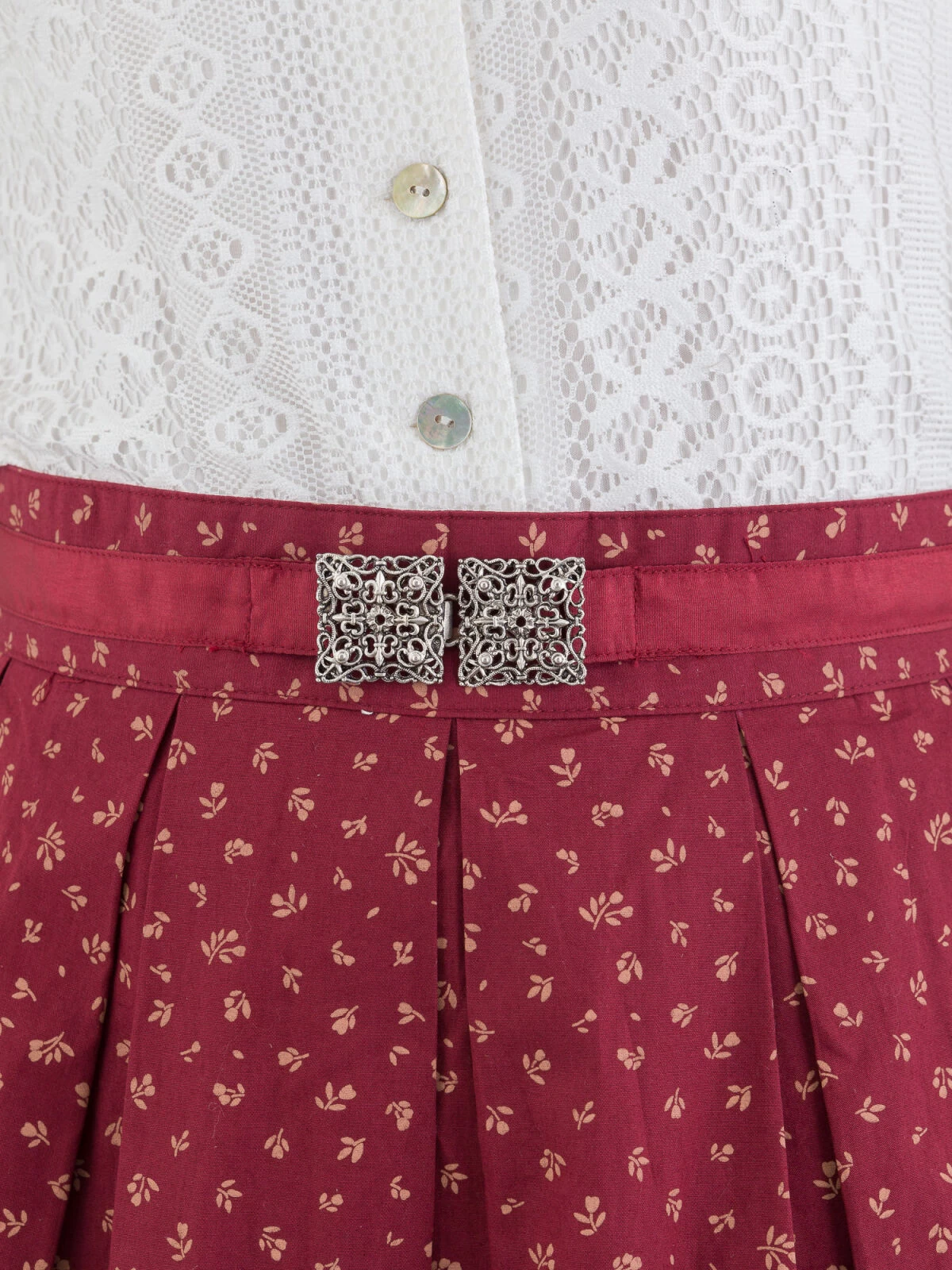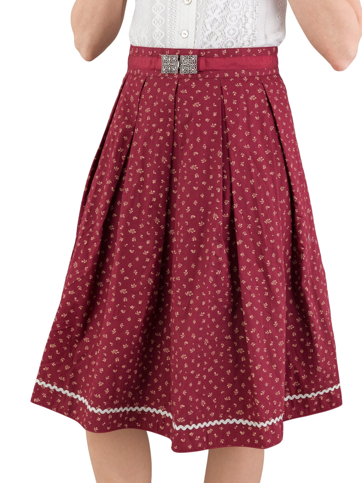 Der Rock ist ein echter Hingucker und bringt Schwung in Ihren Trachtenlook. Mit einer Rocklänge von 65 cm ist er sowohl stilvoll als auch praktisch. Die figurfreundlichen Kellerfalten schmeicheln Ihrer Figur und verleihen dem Rock eine klassische Eleganz. Betonen Sie Ihre Taille mit der filigranen Altsilberschnalle am 5 cm breiten Bund. Das 2 cm breite Satinband am Bund rundet das Design perfekt ab und fügt einen Hauch von Glamour hinzu.