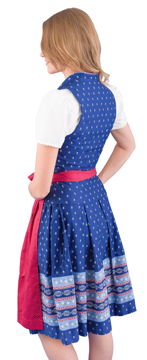 Fescher Trachten 4-teiler D716006S saphirblau 9284 der Marke Turi. Das Mieder mit Schneewittchenkragen wird vorne mit einem Reißverschluss geschlossen. Die weiße Bluse wird vorne geknöpft. Der Ausschnitt mit Schneewittchenkragen passt sich genau dem Mieder an. Der 60 cm lange Baumwollrock ist in Kellerfalten gelegt und wird seitlich mit einem Reißverschluss geschlossen. Den blau gemusterten Baumwollrock zieren im unteren Bereich aufgedruckte Bordüren. Die Baumwollschürze ist rot weiß getupft. Es kann jedes Teil auch einzeln getragen werden. Den 4-Teiler gibt es nur im Set.