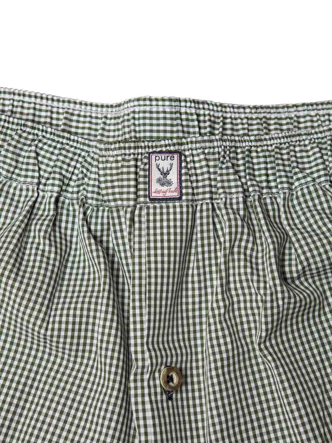 Der moderne Trachtler, der Wert auf korrekte und stilsichere Bekleidung legt. findet mit dieser Boxershort genau das richtige unter die Lederhose. Höchsten Tragekomfort und ideale Bewegungsfreiheit bietet der legere Schnitt dieser Short. Liebhaber reiner Naturfaser werden die 100% Baumwolle überzeugen. Der abgesteppte, stoffbezogene 3,5 cm breite Gummibund sorgt für einen guten Sitz. Mittig ist das Pure Logo angebracht. Der praktische Eingriff ist mit einem Hirschhornknopf zugeknöpft.
