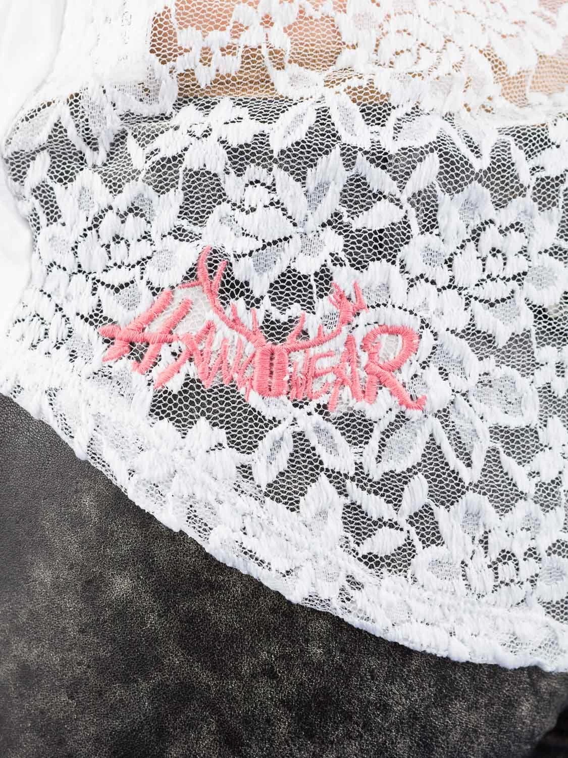 Romantisches Trachten T-Shirt Iska weiß der Marke Hangowear. Das Vorderteil ist mit romantischen Motiven und darüber einer Aufschrift in Pailletten „Liab“ sowie ein Heiz aus Pailetten. Der Rücken ist aus einer schönen Spitze gefertigt. Links unten ist in rosa die Marke Hangowear aufgestickt.