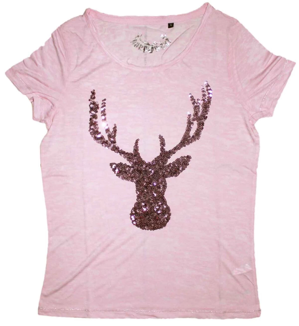 Trendiges tailliertes Trachten T-Shirt Vanda rose der Marke Hangowear. Am Vorderteil ist ein Hirschkopf aus rosa Pailletten aufgenäht. Die Rückenlänge bei Gr. S beträgt 60 cm.