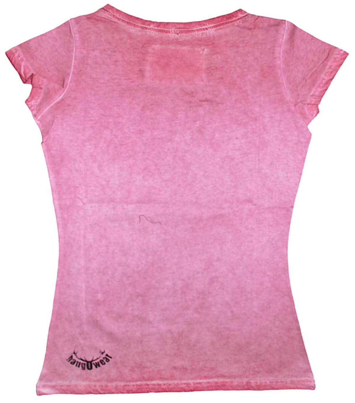 Trendiges tailliertes Trachtenshirt mit Pailletten und Aufdruck Modell Veluxe rot oilwashed der Marke Hangowear. Unter dem roten Paillettenherz befindet sich ein schwarzer Aufdruck „Ohne di is ois Bled“