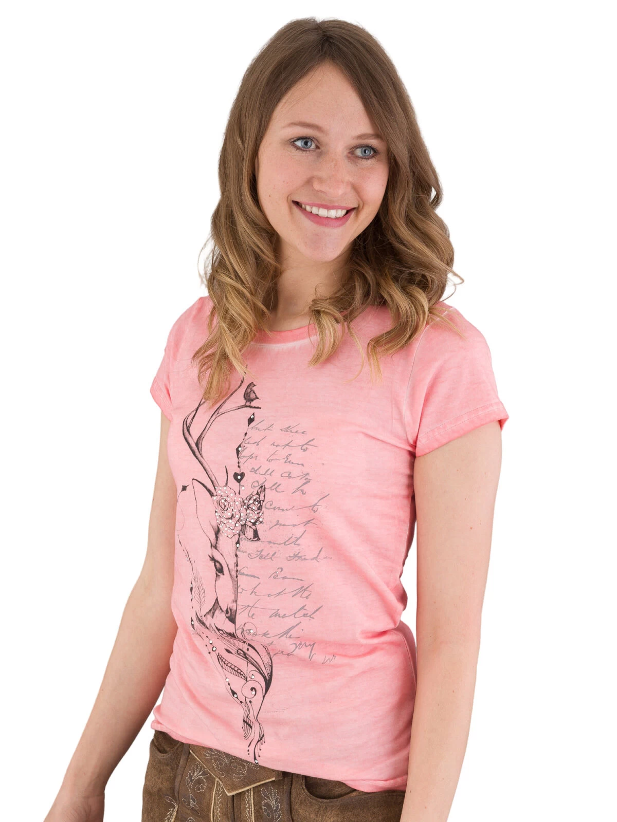 Das Trachten T-Shirt MarJo CW-6-Ulla peach ist ein absoluter Hingucker! Es ist aus 100% Baumwolle, hat einen interessanten Druck am Vorderteil und ist mit Strasssteinen verziert. Der Look wird durch ein aufgenähtes Herz mit dem MarJo Markenlabel am rechten Ärmel und einem Rundhalsausschnitt abgerundet. Der schmale Schnitt und die gewaschene Optik machen das T-Shirt zu einem echten Highlight.