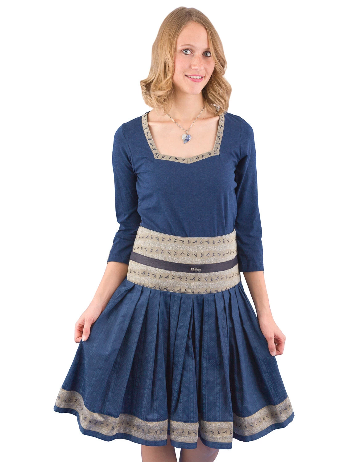 Trachtenshirt 318212 blau der Marke Stoiber. Das Shirt passt besonders gut zu Rock und Jeans. Der Ausschnitt mist mit einer beigen Borte mit blauen springen Hirschen eingefasst. Die gleiche Borte befindet sich am 3/4 Ärmel.