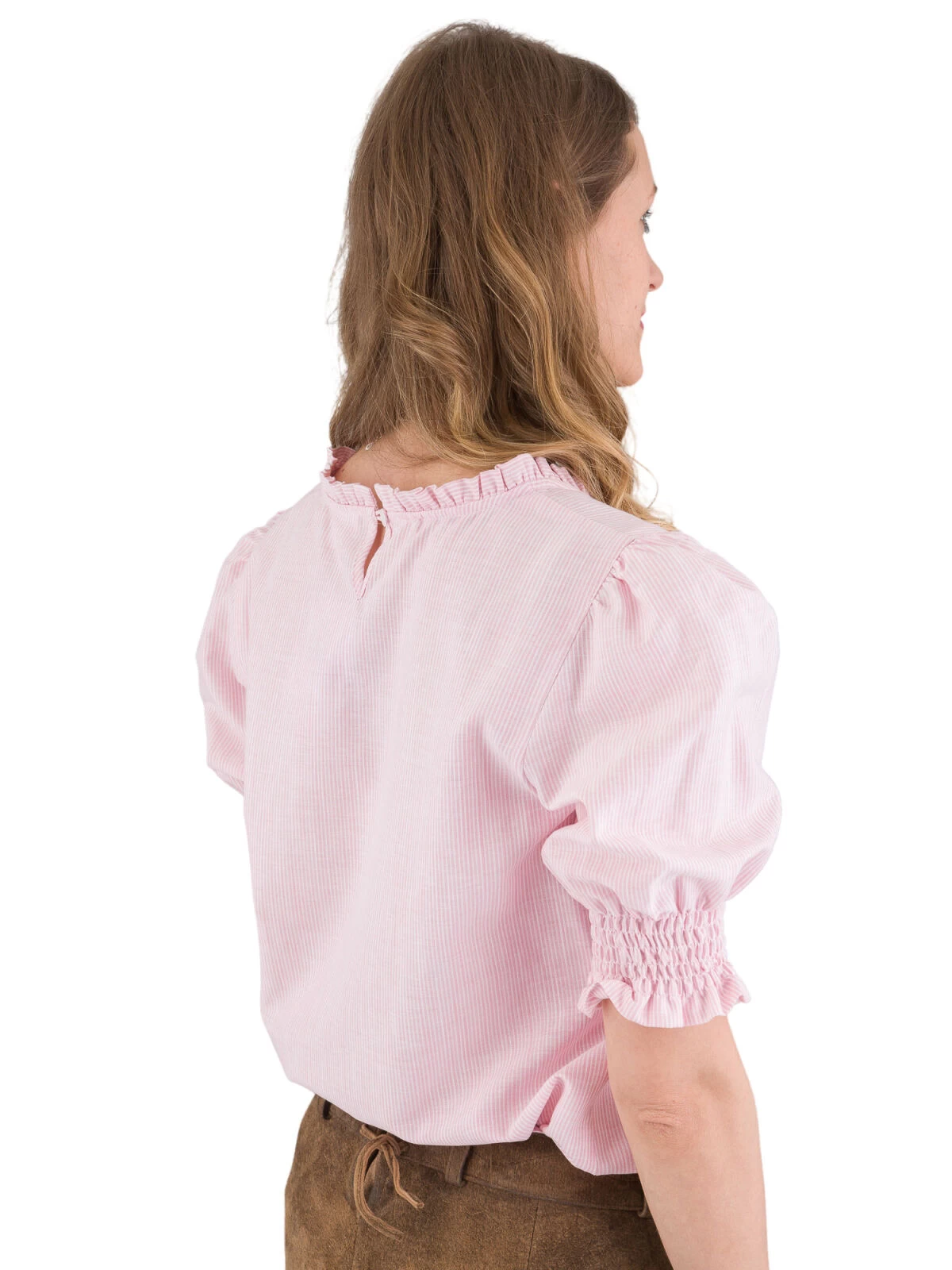 Die Trachtenbluse besticht durch ihr rosa-weiß gestreiftes Design und verleiht Ihnen eine frische und lebendige Ausstrahlung. Der Rundhalsauschnitt, verziert mit einer 1,5 cm Rüsche, verleiht dem Ganzen eine verspielte Note und betont gekonnt Ihre feminine Seite. Die Halbarm-Ärmel mit gesmoktem Bündchen sorgen nicht nur für angenehmen Tragekomfort, sondern unterstreichen auch die liebevollen Details dieser Bluse.