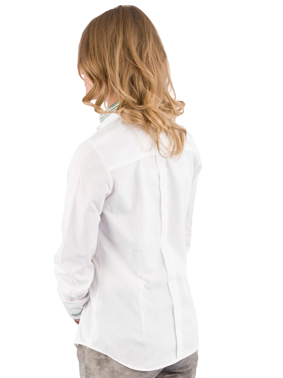 Hochwertige bestickte Trachtenbluse GS01/172 weiss grün der Marke Gweih & Silk. Die taillierte Damenbluse hat eine sehr gute Passform und besticht mit vielen liebevollen Details. Tannengrüner Kreuzstich an Kragen und Ärmelmanschette zieren die Baumwollbluse. Die Rückenlänge bei Gr. 34 beträgt 63 cm.