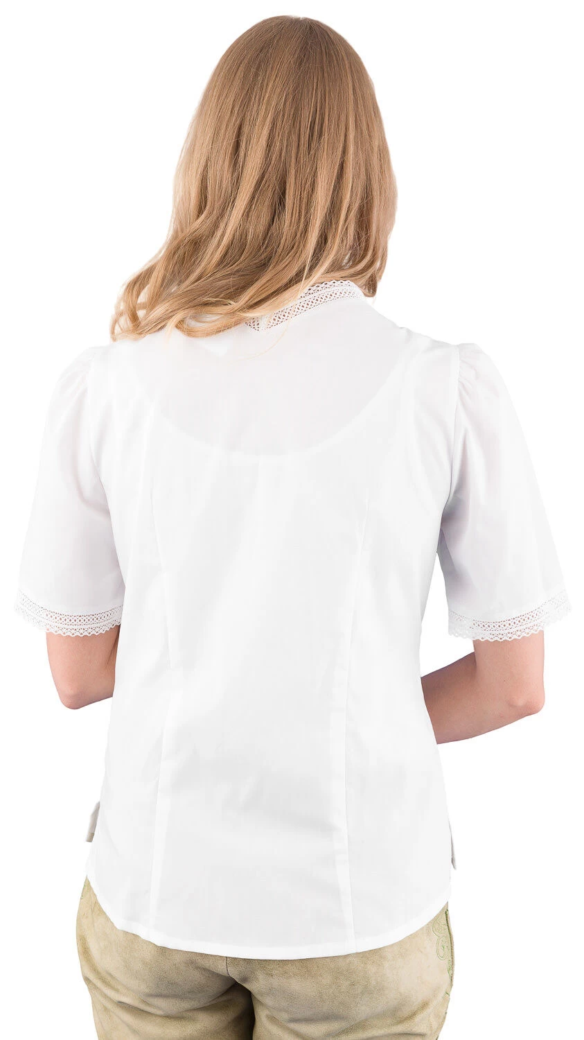 Trachtenbluse 02 5056 73 weiß der Marke Augenstern. Die Bluse zierten schöne Baumwollspitzen und Biesen am Vorderteil. Durch eine Stretchanteil trägt sich die Bluse sehr bequem. Sie ist sehr figurfreundlich geschnitten. Die Rückenlänge bei Gr. 40 beträgt 60 cm.