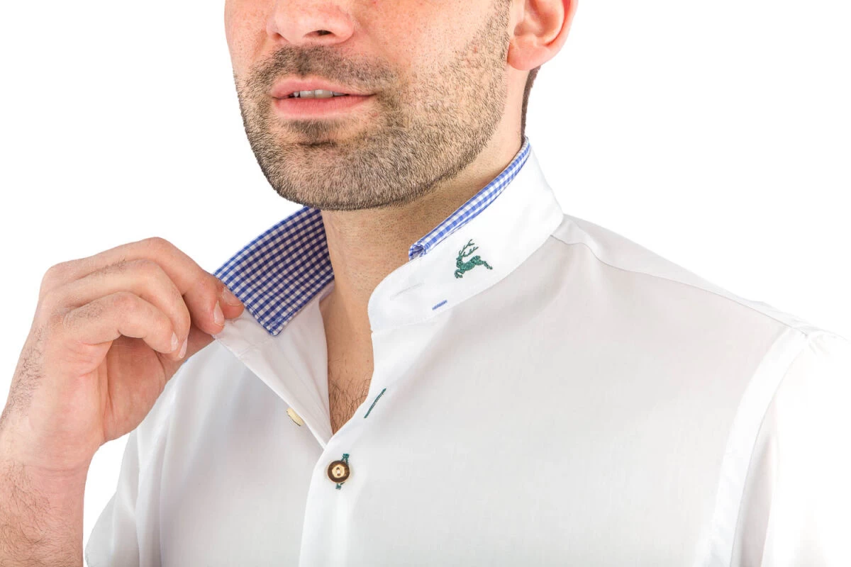 Hochwertiges Trachtenhemd 2624-255 in der Farbe 30 weiß blau der Marke Arido. Das Hemd besticht mit dem schönen Stehkragen, von dem ein blau karierter Kragen rausragt. Die Ärmelbündchen sind ebenfalls innen blau kariert ausgearbeitet und ca. 1,5 cm breit nach außen umgeschlagen und mit einem kleinen Hirschhornknopf fixiert. Am Stehkragen links befindet sich ein tannengrüner springender Hirsch. Die obersten 2 Knopflöcher unter dem Stehkragen sind grün genäht. Der Baumwollstoff ist sehr pflegeleicht ausgerüstet und erleichtert somit das Bügeln. Das Hemd ist zwar Slim, fällt aber groß aus. Bitte 1 Nummer kleiner bestellen.