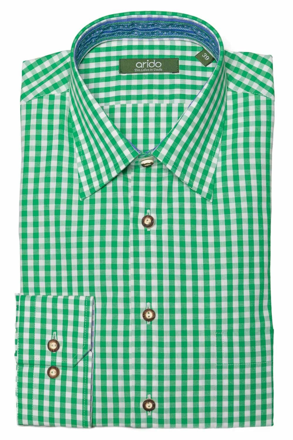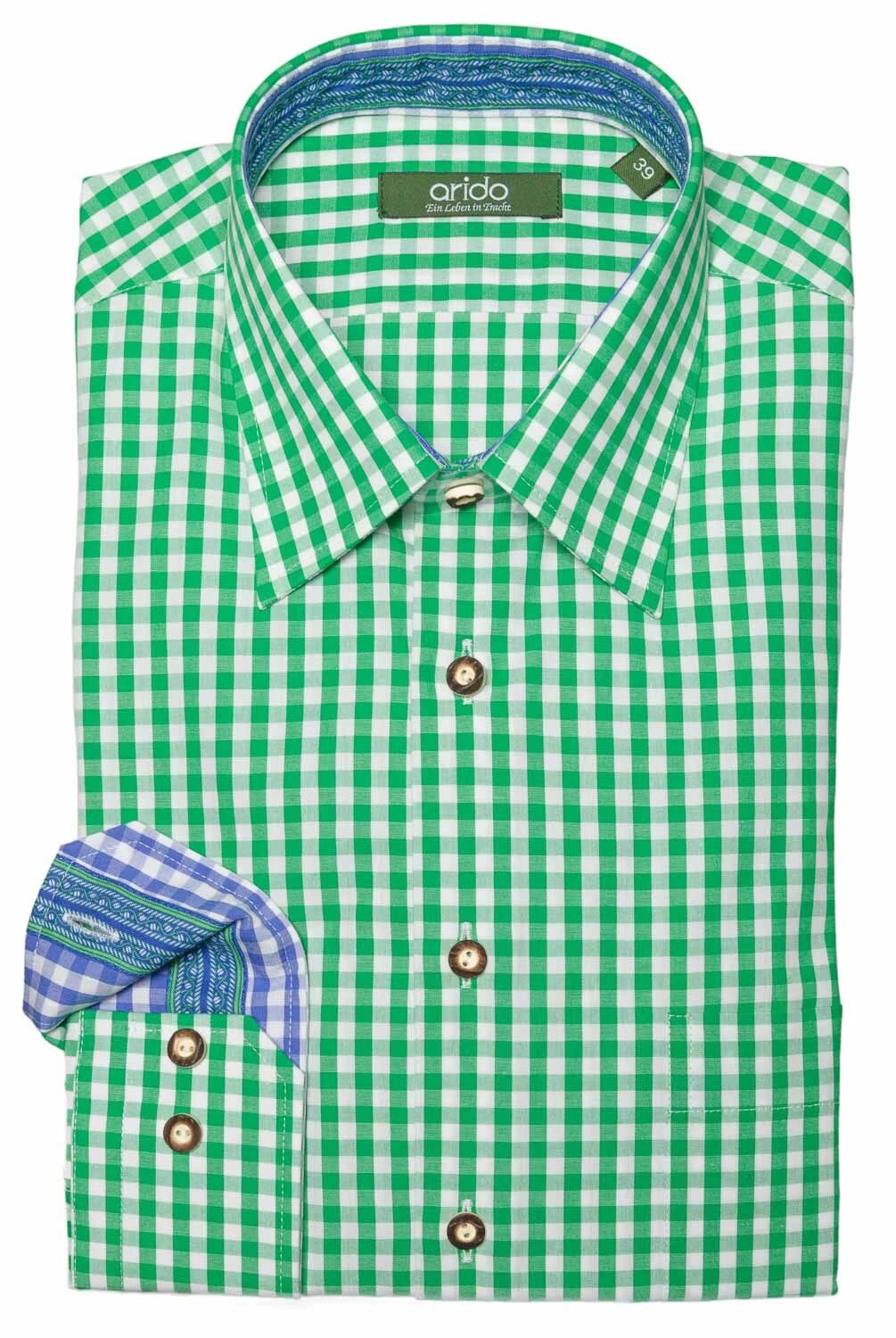 Sportives Trachtenhemd 2711 1001 Slim grün kariert Fb. 14 der Marke Arido. Das Hemd ist nur sehr leicht tailliert. Das hochwertige Trachtenhemd ist am Kragensteg innen und an den Ärmelbündchen innen blau kariert ausgearbeitet. Darüber ist ein 2 cm breites blau grün gemustertes Band angenäht. Das Baumwollhemd hat links eine Brusttasche angebracht. Die hochwertige Qualität spüren Sie beim Tragen als auch beim Waschen und Bügeln. Ob zur Tracht oder nur zur Jeans, mit diesem Hemd werden Sie bestimmt sehr viel Freude haben!