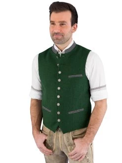 Trachtenhemd 2885 1494 Vichy Karo blau der Marke Arido. Das Baumwollhemd ist am Kragensteg innen sowie an den Ärmelbündchen innen mit blau weiß kariert ausgearbeitet. An der Knopfleiste befindet sich eine grüne Kreuzstich Stickerei. Um den Kragen und entlang der Knopflochleiste ist eine Handsteppnaht in grün.