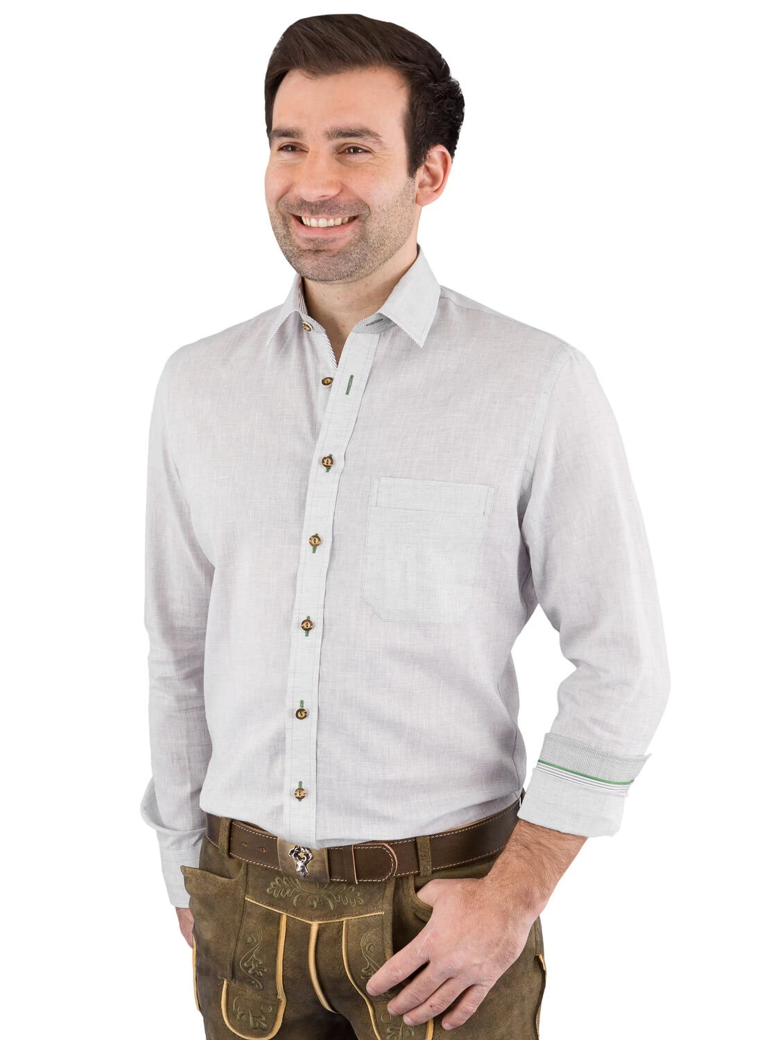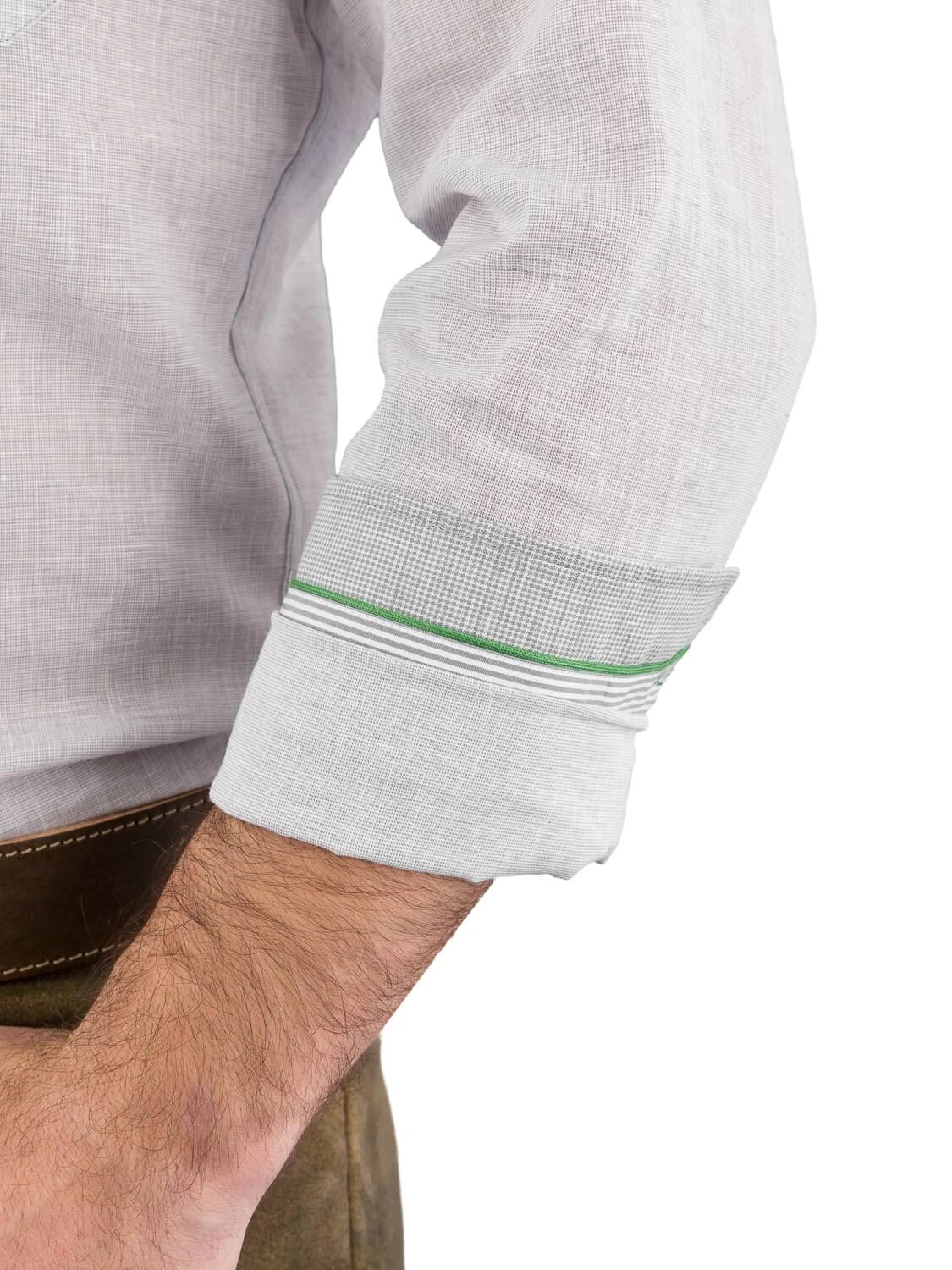 Modisches Trachtenhemd 2886 3115 grau der Marke Arido. Das Baumwollhemd im aktuellen grau ist mit liebevollen Details ausgearbeitet. Knopflöcher sind grün genäht. Links befindet sich eine aufgenähte Brusttasche. Kragensteg und Ärmelbündchen sind grau weiß gestreift und grau weiß kariert ausgearbeitet. Der Unterkragen ist grau weiss gestreift und der Kragensteg aussen ist grau weiss kariert. Der Ärmelschlitz ist grau weiss kariert besetzt.