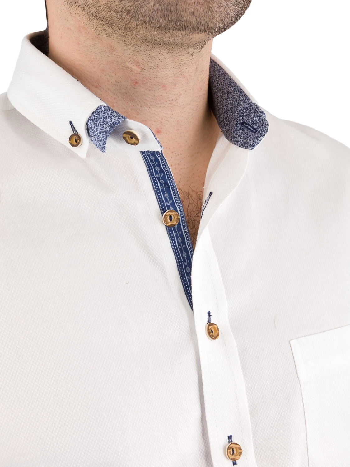 Hochwertiges, modisches Trachtenhemd 2899 3295 weiß blau der Marke Arido. Das Hemd mit einem raffiniertem doppelt Kragen als Button down ist blau ausgearbeitet. Der weisse Baumwollstoff ist strukturiert und hat an der linken Seite eine Brusttasche aufgesetzt. Das Hemd ist im Modern Fit Schnitt gearbeitet. Bitte Maßtabelle beachten.