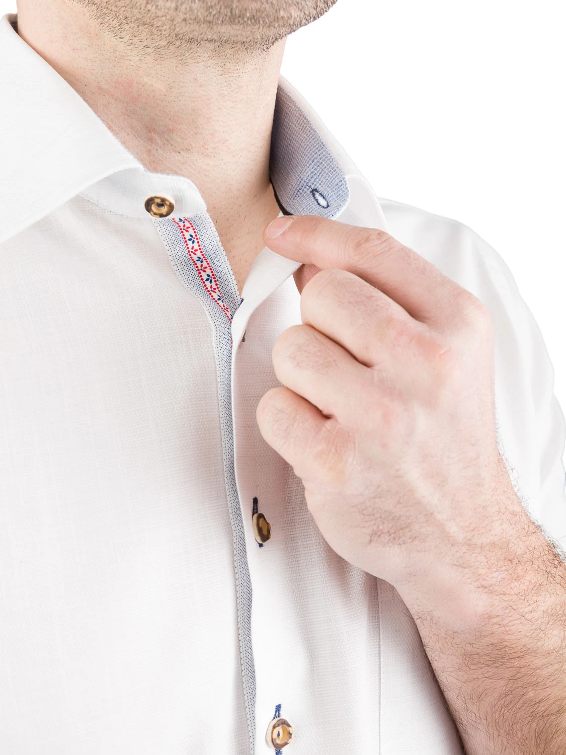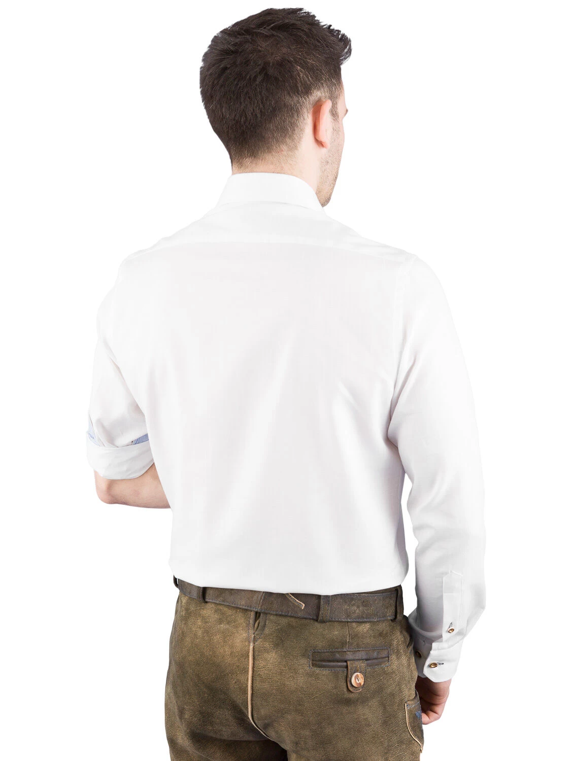 Hochwertiges Trachtenhemd weiß blau 2901 3333 der Marke Arido. Das strukturierte weiße Hemd ist am Kragensteg innen sowie an den Ärmelbündchen innen mit hellblauen Pepitakaro ausgearbeitet. Die Knopfleiste ist mit einer bunten Bordüre verziert. Links ist eine aufgenähte Brusttasche angebracht.