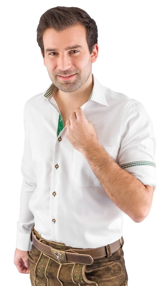 Trachtenhemd langarm Slim Fit 2791 2719 weiß grün 40 der Marke Arido. Das Slim Fit von Arido ist jedoch nicht sehr schmal. Bitte Größentabelle beachten. Das pflegeleichte Hemd mit aufgenähter Brusttasche besticht mit liebevollen Details wie grün karierter Einsatz an Kragensteg und Ärmelbündchen, grüne Knopflöcher, sowie eine grüne Bordüre mit aufgedruckten springenden Hirschen in weiß an der Knopfleiste.
