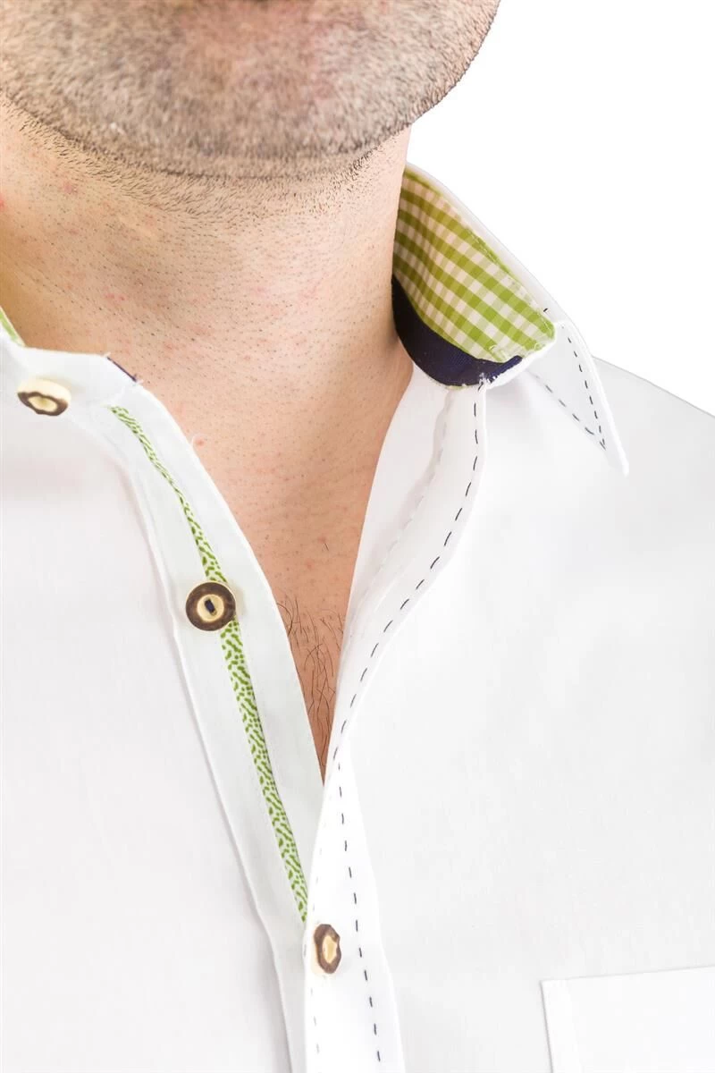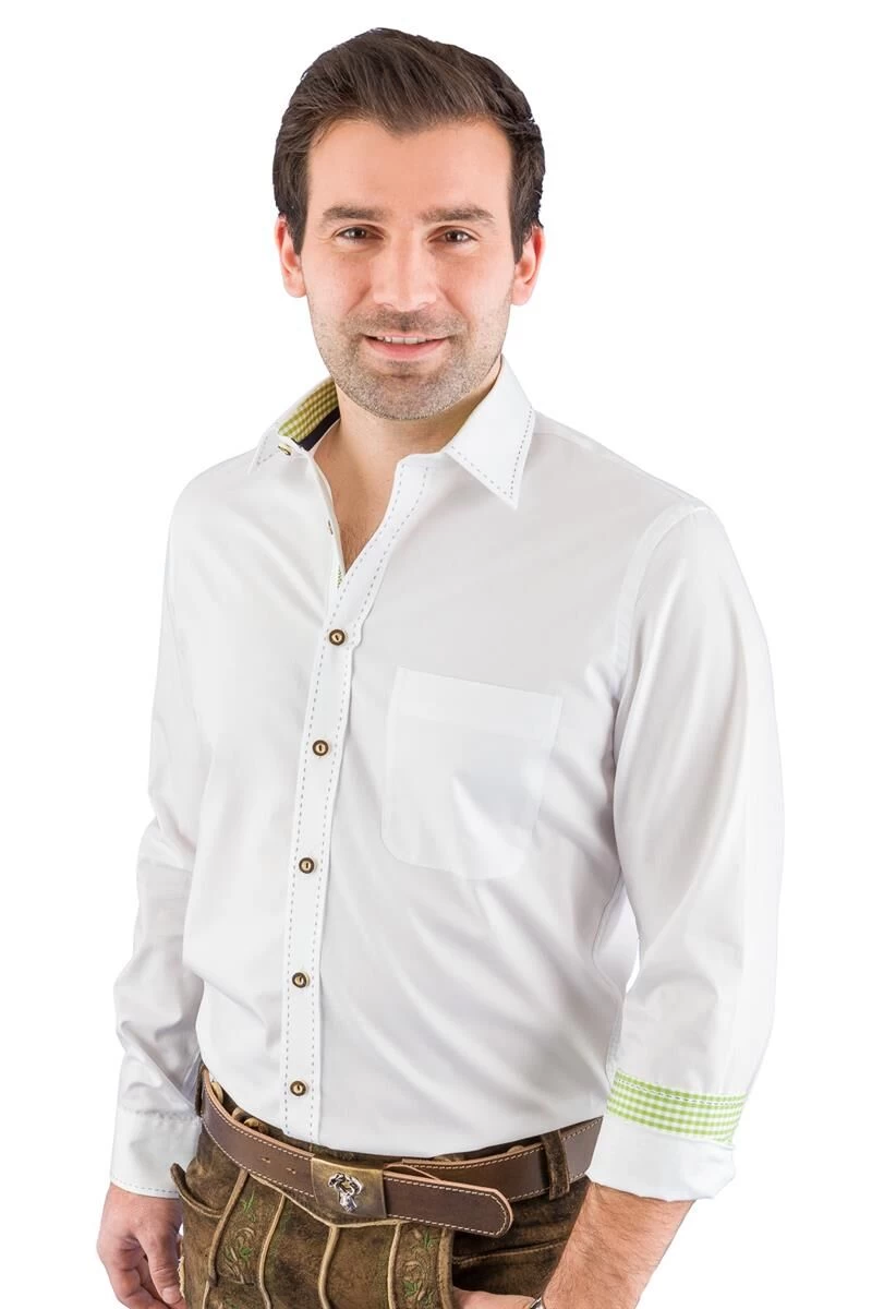 Trachtenhemd langarm 2827 2622 weiß apfelgrün 40 der Marke Arido. Das hochwertige, pflegeleichte Baumwollhemd ist am Kragen und Ärmelbündchen apfelgrün kariert ausgearbeitet. Am Kragensteg ist zusätzlich ein marineblaues Band eingenäht. In der aufwändig verarbeiteten Knopfleiste spitzt ein grün gemustertes Band zwischen zwei weißen Bändern hervor. Der Kentkragen, die Ärmelbündchen und die Knopflochleiste sind dunkelblau gesteppt. Links befindet sich eine aufgenähte Brusttasche. Das Slim Fit Hemd ist nur sehr leicht schlank geschnitten. Bitte die Größentabelle beachten.