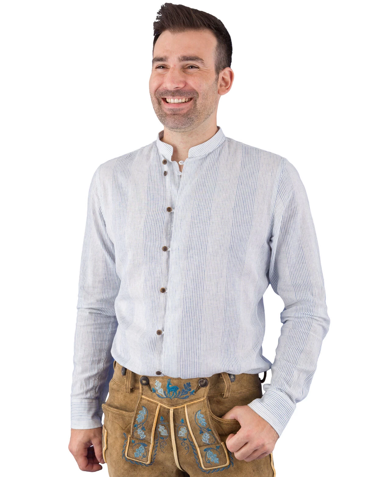 Aktuelles Leinenhemd Wallersee weiß blau gestreift von der Marke Gweih & Silk. Das Stehkragnhemd im tailored fit ist mit besonders schönen Hornknöpfen geschmückt. Die Knöpfe werden mit Knopfschlaufen geschlossen. Ein besonders angenehmes Tragegefühl bietet die Stoffqualität aus 55% Leinen und 45% Baumwolle.Dieses attraktive Hemd ist nicht nur zur Tracht sehr schön, sondern gibt der Jeans auch ihren eigenen Charakter.