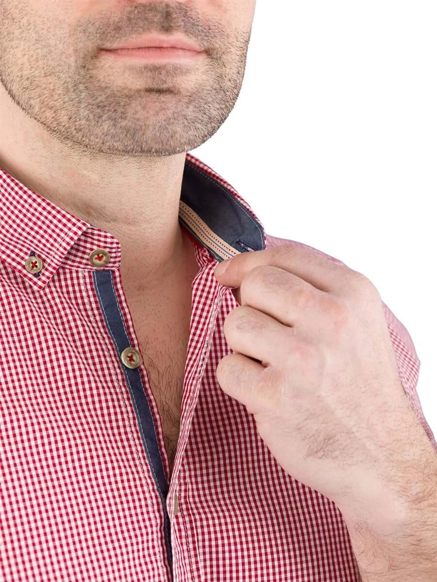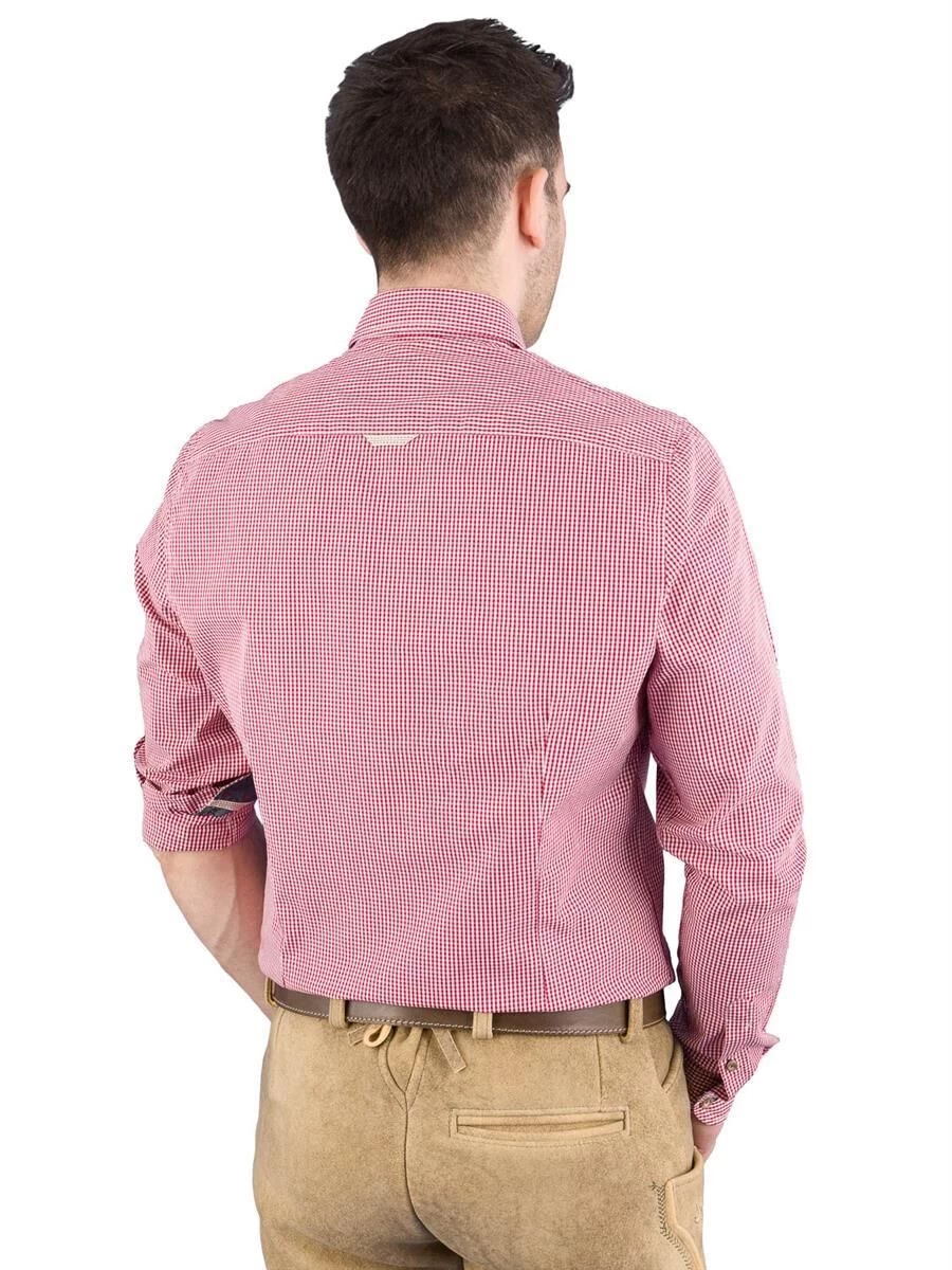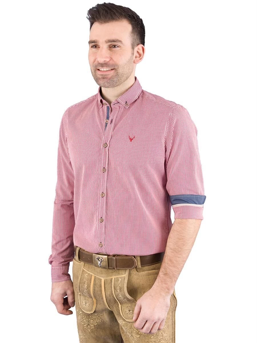 Klassisches Trachtenhemd Slim Fit rot Karo 5002-21200 der Marke Pure. Das Pepita Karo ist ein Klassiker. Das Hemd hat an der linken Brust einen roten Hirschkopf aufgestickt. Der Kragensteg innen sowie die Ärmelbündchen und Knopfleiste sind blau ausgearbeitet. Der Kragen ist ein Button-down-Kragen.