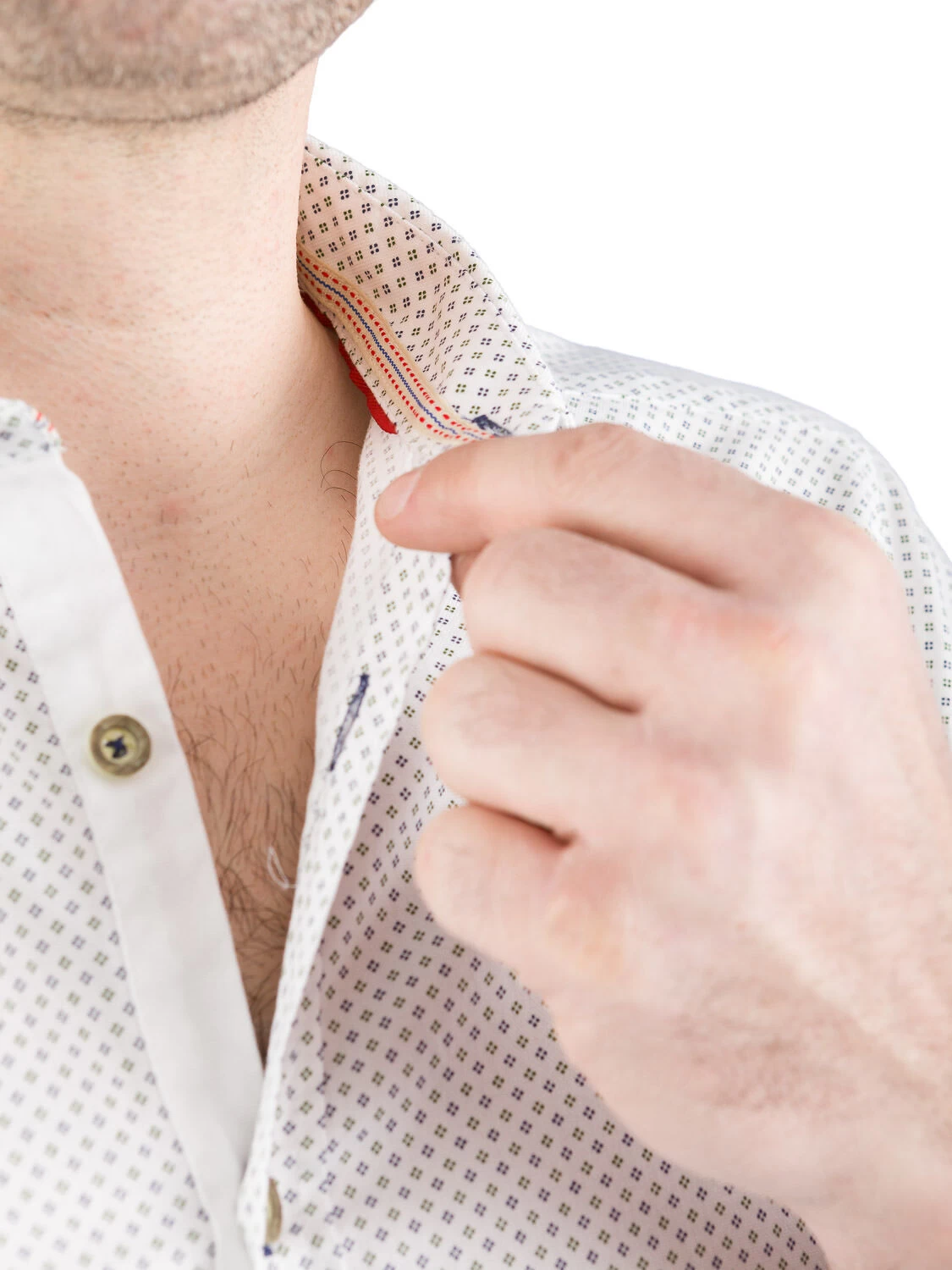 Aktuelles Trachtenhemd Slim Fit 5003-21602 weiß mit Druck blau und grün der Marke Pure. Das Trachtenhemd wird mit Hirschhornknöpfen geknöpft. Die Knopfleiste ist ist ganz weiß. Am Kragensteg innen und an den Ärmelbündchen ist ein beiges Band eingenäht, das blau und rot gesteppt ist.