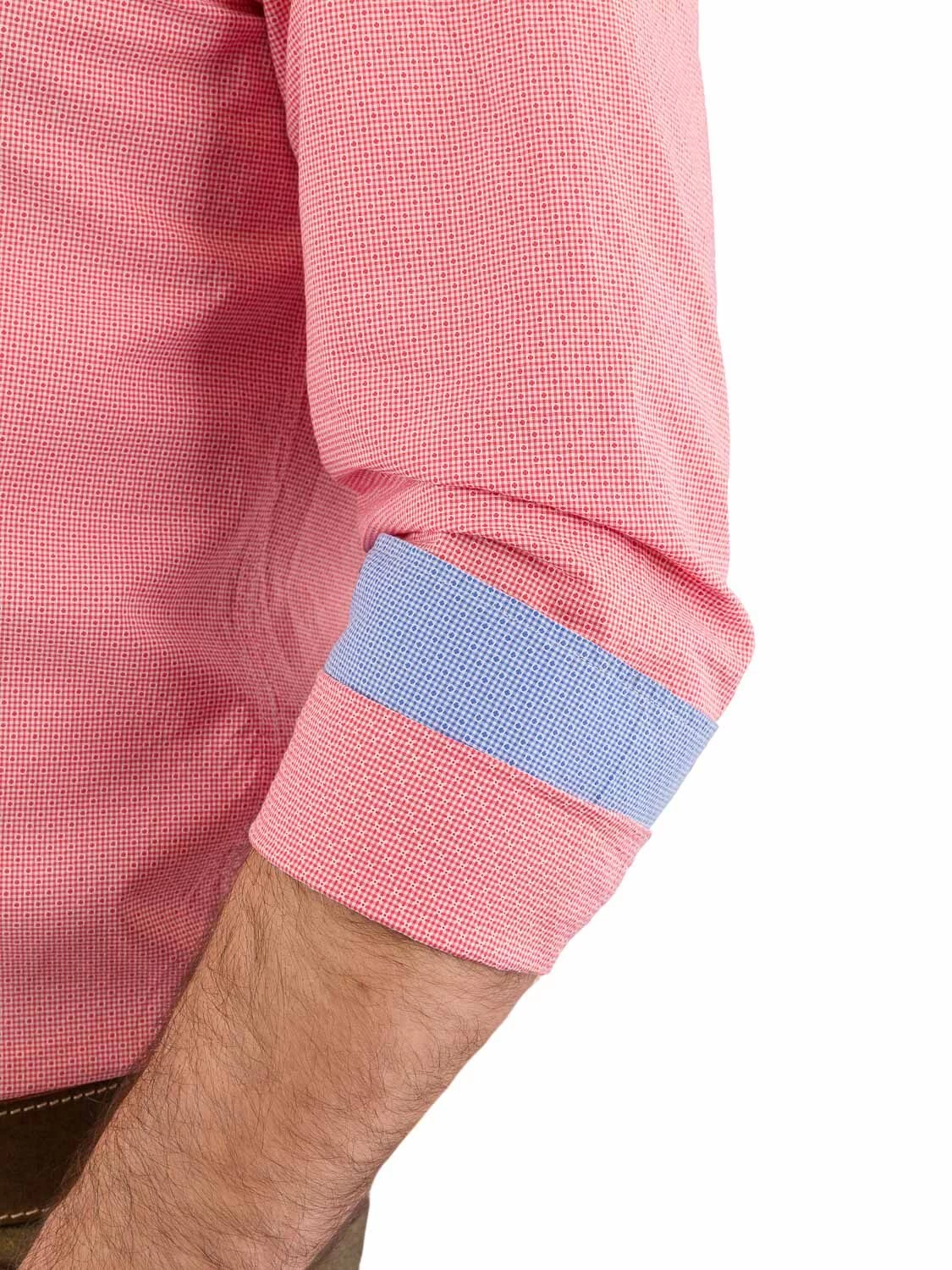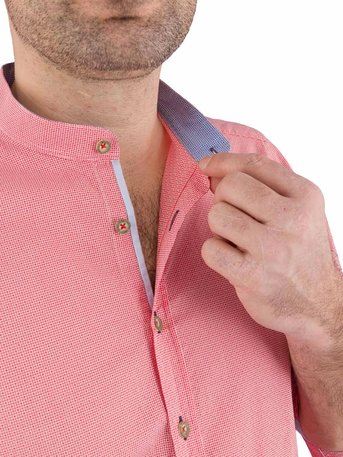 Aktuelles Trachtenhemd C52600-21697 karo rot C52600-2697 der Marke Pure. Das Stehkragenhemd in leichter Seesuckeroptik ist am Kragen innen, sowie an den Ärmelbündchen innen blau kariert ausgearbeitet. Die Knopflöcher sind dunkelblau genäht. Entlang der Knopfleiste und die Ärmelschlitze sind mit einem hellblauen Stoff eingefasst.