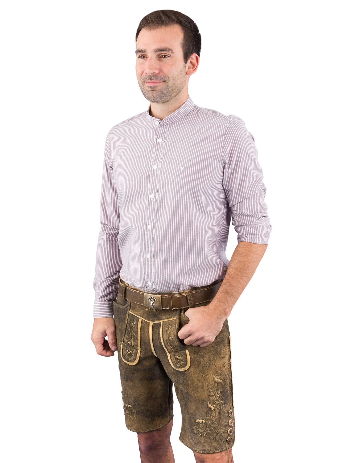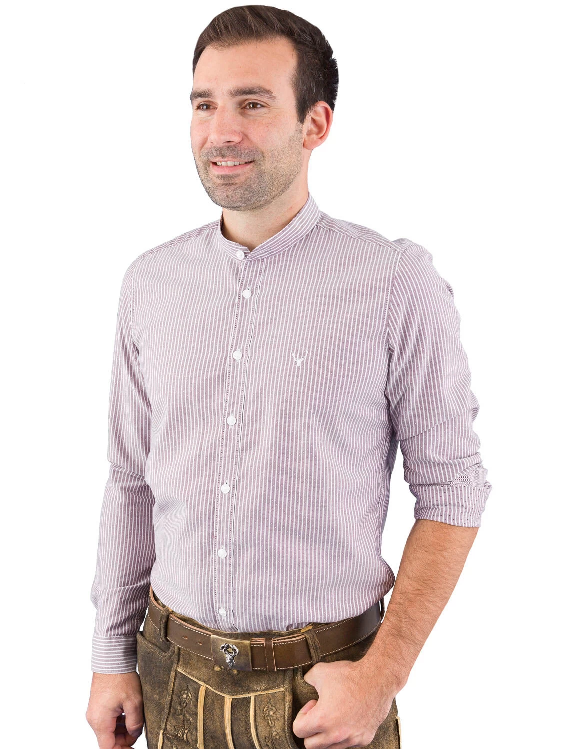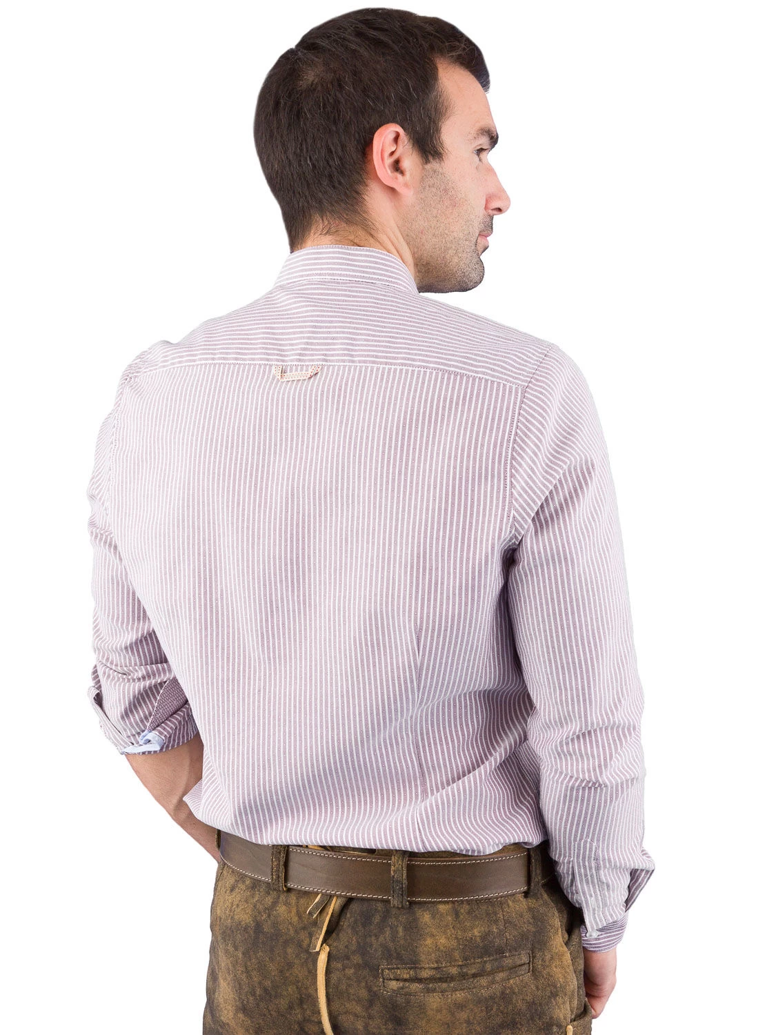 Stehkragenhemd C62623/21617/160 bordeaux der Marke Pure. Das aktuelle Streifenhemd ist mit traditionellen Wäscheknöpfen ausgestattet. Der 3,2 cm hohe Stehkragen sowie die Ärmelbündchen innen sind mit einem bordeaux gemusterten Stoff ausgearbeitet. Die Knopfleiste und der Ärmelschlitz sind hellblau eingefasst. Das Hemd ist Slim Fit geschnitten, jedoch nicht extrem eng.