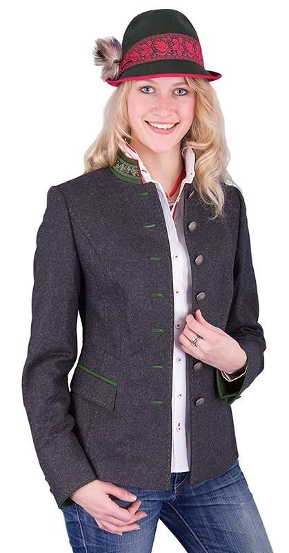 Die Trachtenjacke Abenab ist aus der Kollektion Kaiseralm von Auzinger. Die traditionelle Jacke ist mit sehr viel Liebe zum Detail gefertigt. Die grünen Nähte an den Abnähern der tailierten Jacke formen eine schlanke Figur. 7 Metallknöpfe, der grüne Paspel an den Taschen und an den Knopflöchern machen die Jacke pfiffig. Eine gewebte, gemusterte Bordüre ziert den Kragen.