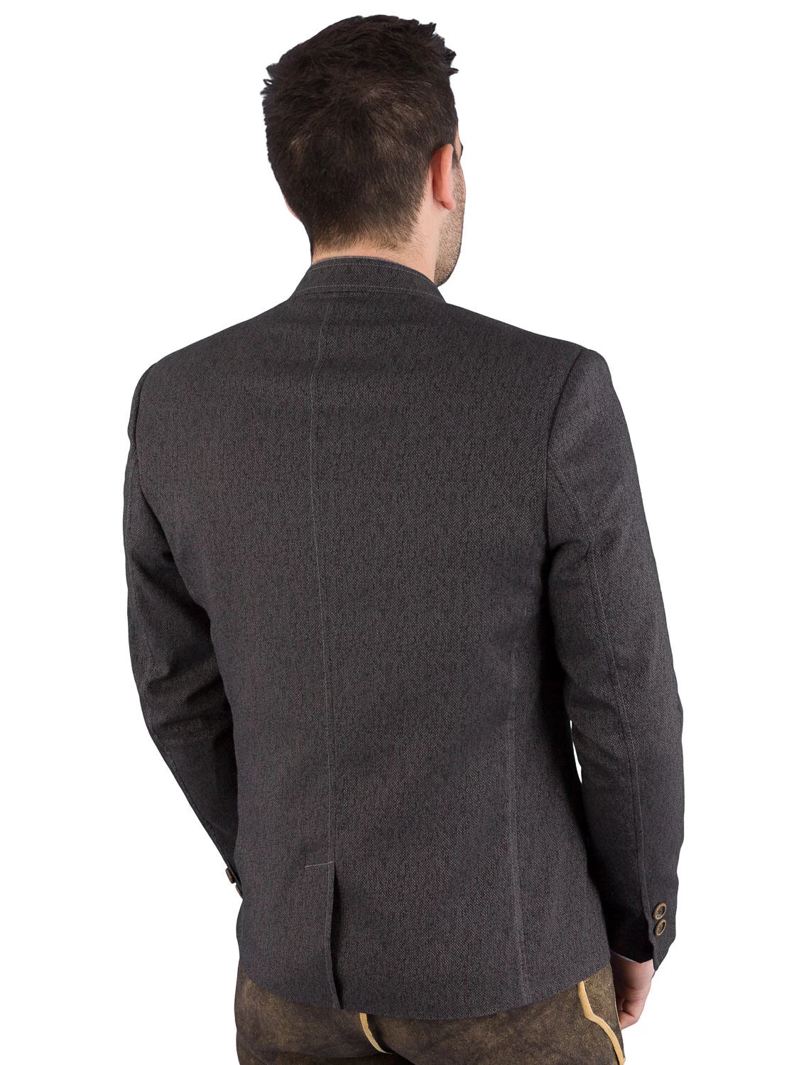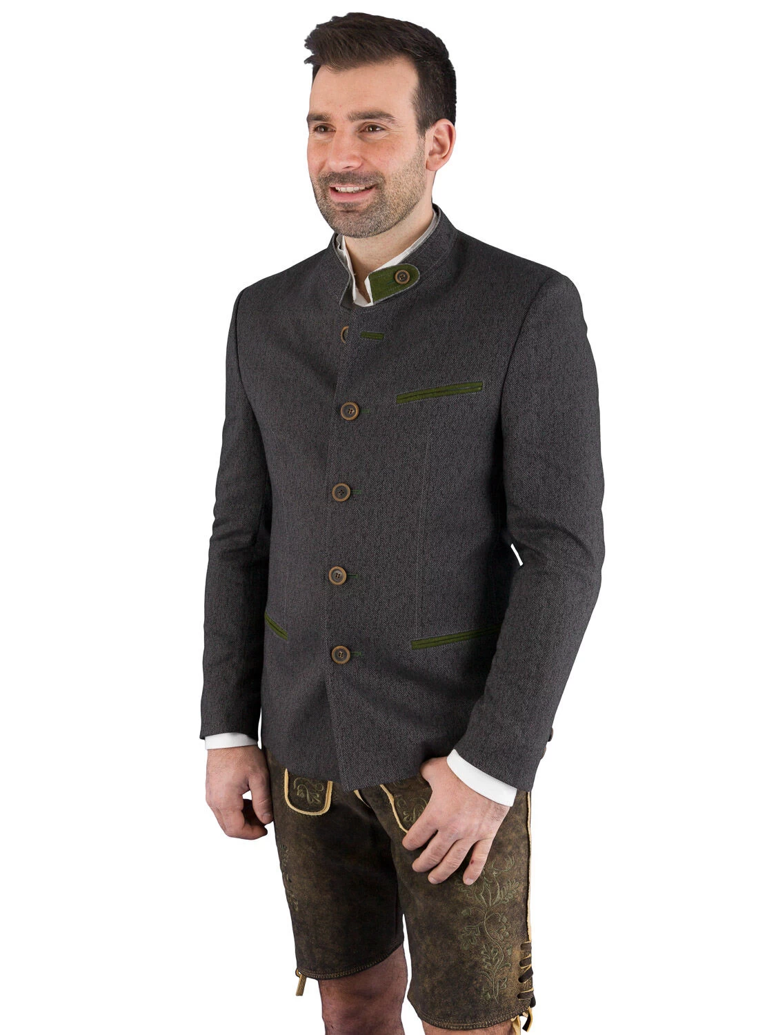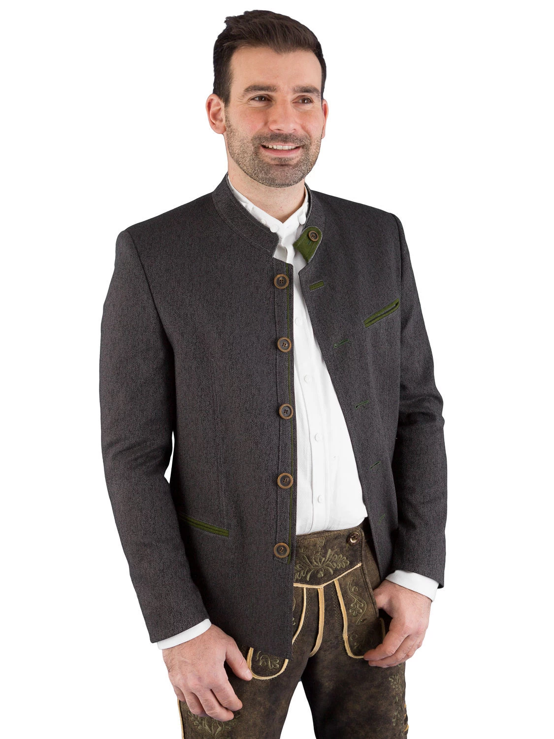 Aktuelle Trachtenjacke Füssen-Q 5457 anthrazit der Marke Allwerk. Die Jacke mit Stehkragen hat eine Llim Fit Schnitt. Der Stehkragen mit grüner Lasche ist 3,5 cm hoch. Das oberste Knopfloch sowie die Taschen sind grün auspaspeliert. Die Rückenlänge bei Gr. 48 beträgt 70 cm. Am Rücken ist ein 13 cm langer verdeckter Schlitz eingearbeitet. Die Jacke ist grün gefütter und verfügt über 2 Innentaschen.
