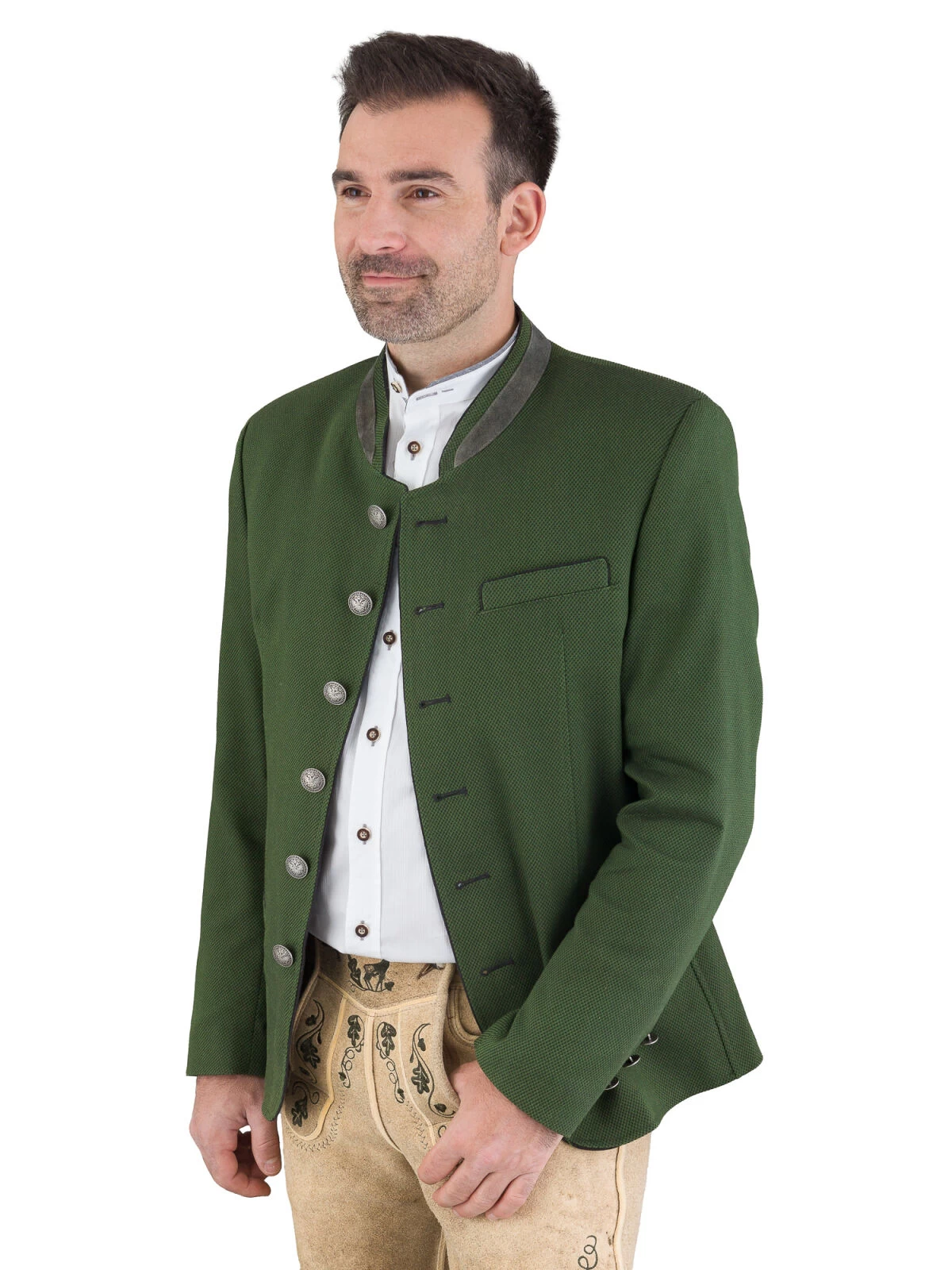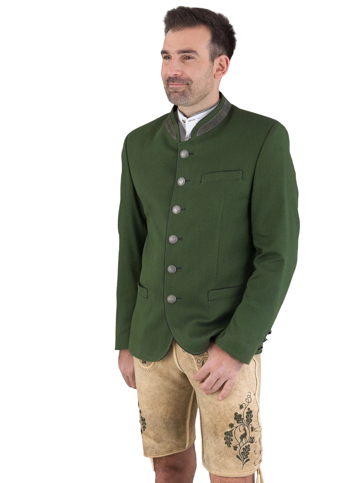 Die Trachtenjacke von Allwerk Modell Kals in Grün ist ein echter Hingucker. Der Oberstoff besteht aus 65 % Baumwolle und 35 % Polyester und ist somit sehr angenehm zu tragen. Der 3,5 cm hohe Stehkragen ist mit Leder besetzt und die schönen Altsilberknöpfe verleihen der Jacke einen edlen Look. Der glatte Rücken ist mit 14 cm überdeckten Schlitzen versehen und die 2 Innentaschen bieten viel Platz für kleine Gegenstände. Der Besatz und die Paspel sind schwarz und das schöne grasgrüne Futter rundet das Design ab. Der Slim Fit Schnitt betont die Figur und sorgt für einen modernen Look.