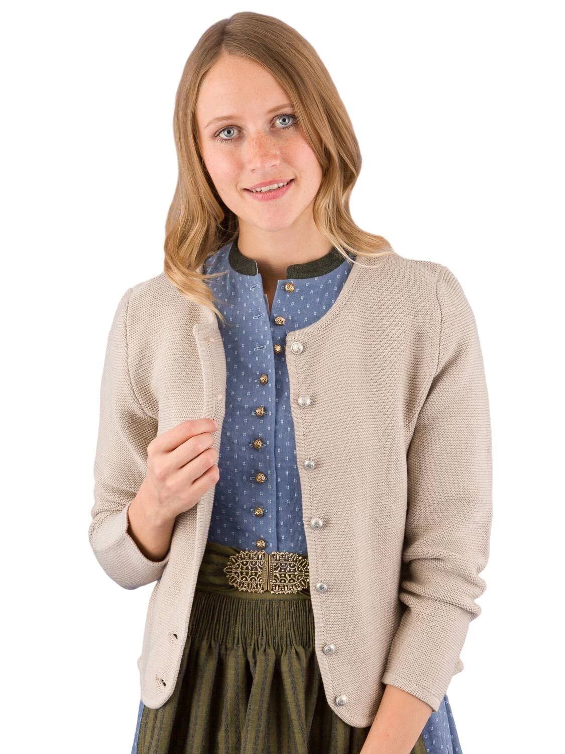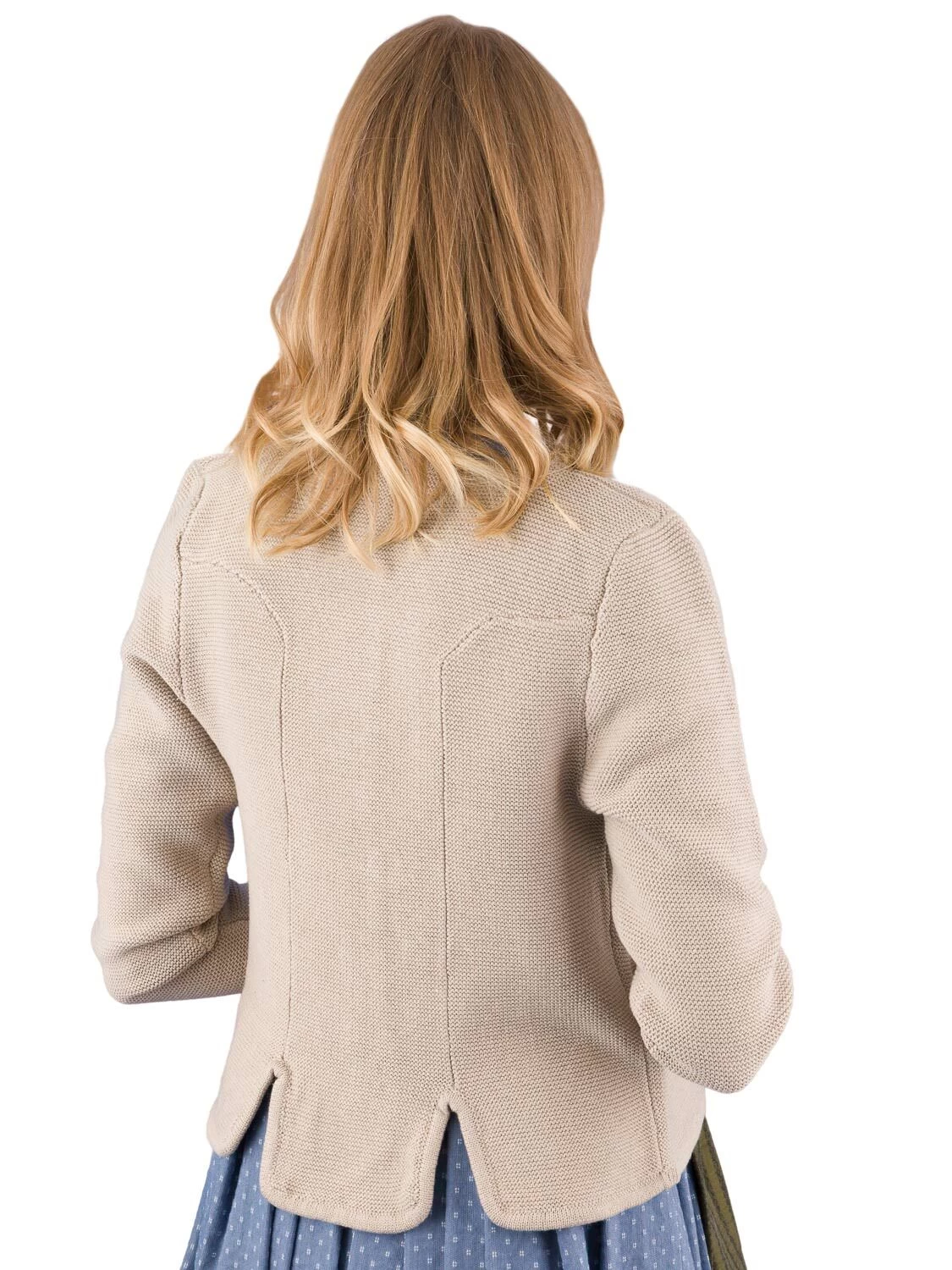 Trachten Strickjacke Lina beige der Marke AlpSpur. Die Jacke aus Baumwolle Mischung passt sehr gut zu Dirndln und kratzt nicht. Die beiden 8 cm langen Schlitze im hinteren Bereich geben dem Dirndlrock die Möglichkeit sich zu entfalten. Die Rückenlänge bei Gr. 32 beträgt 52 cm. Die Ärmellänge ist 7/8.