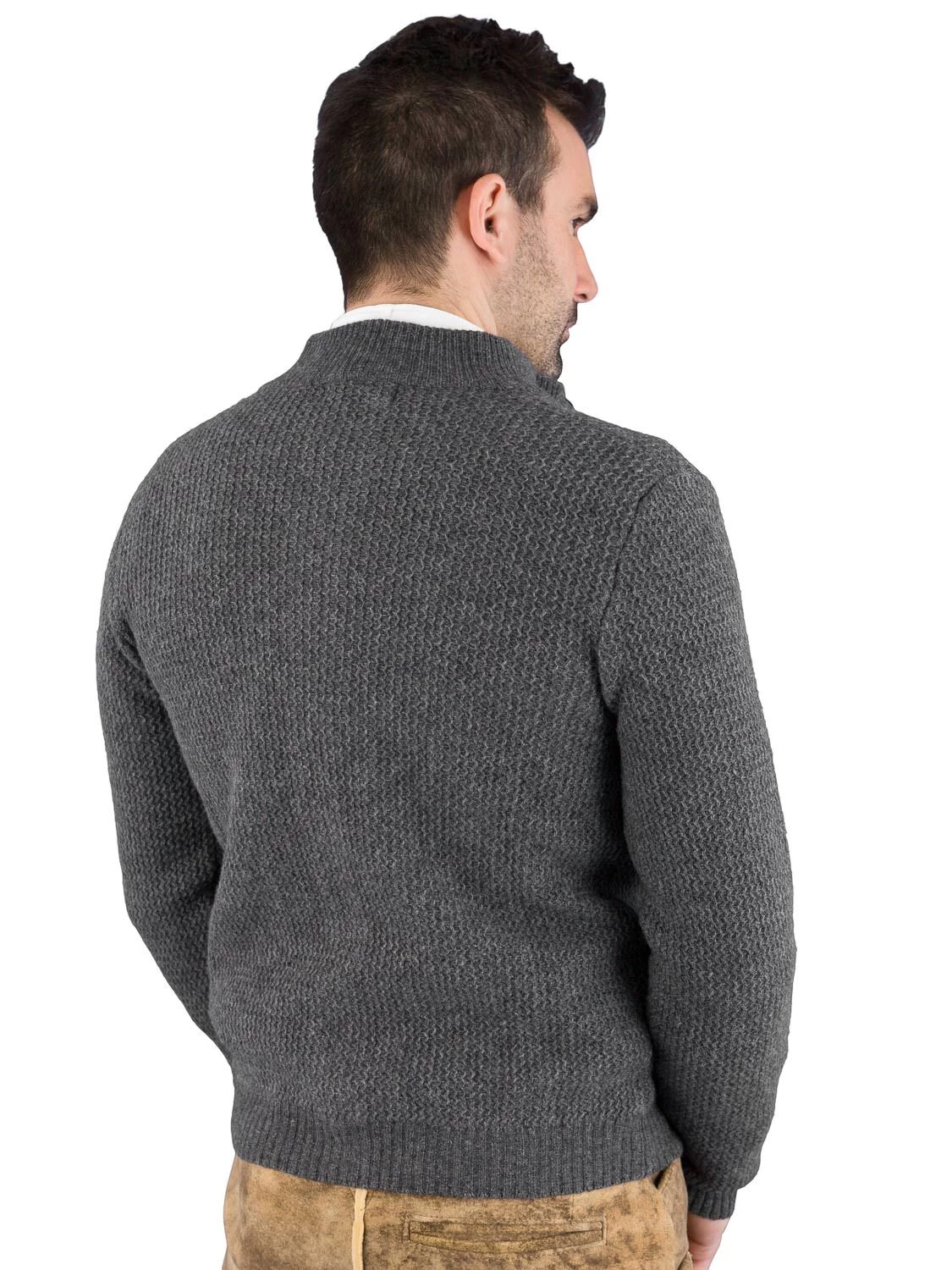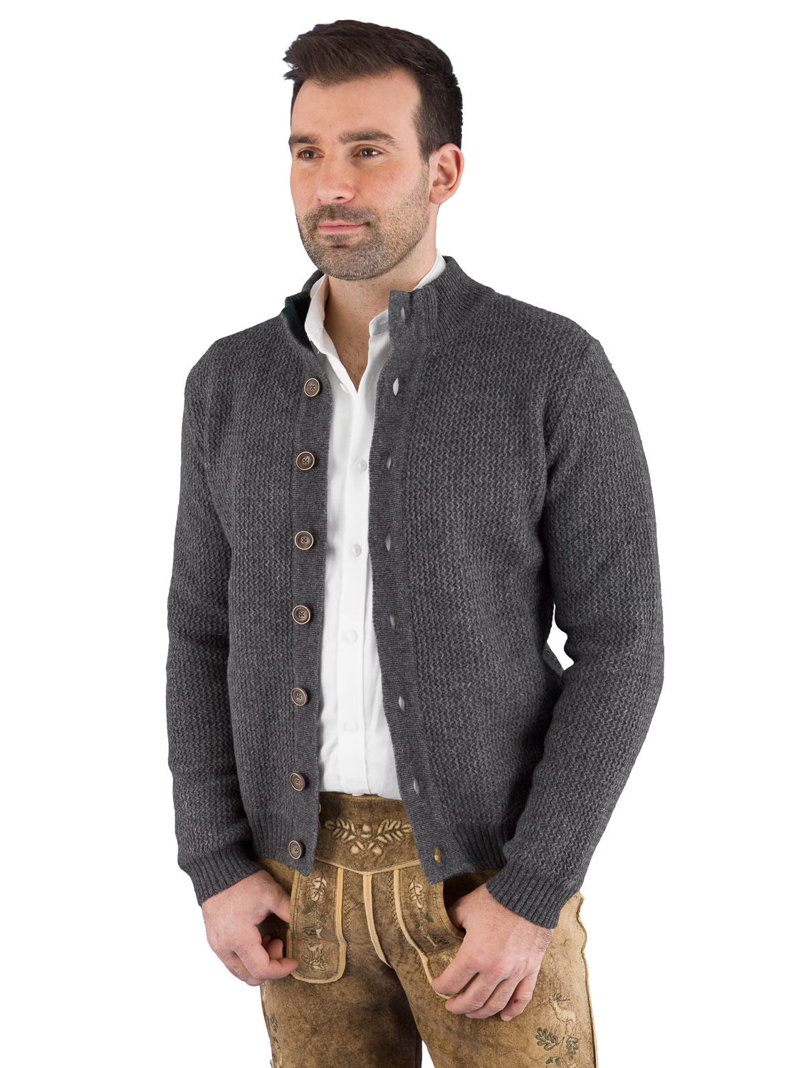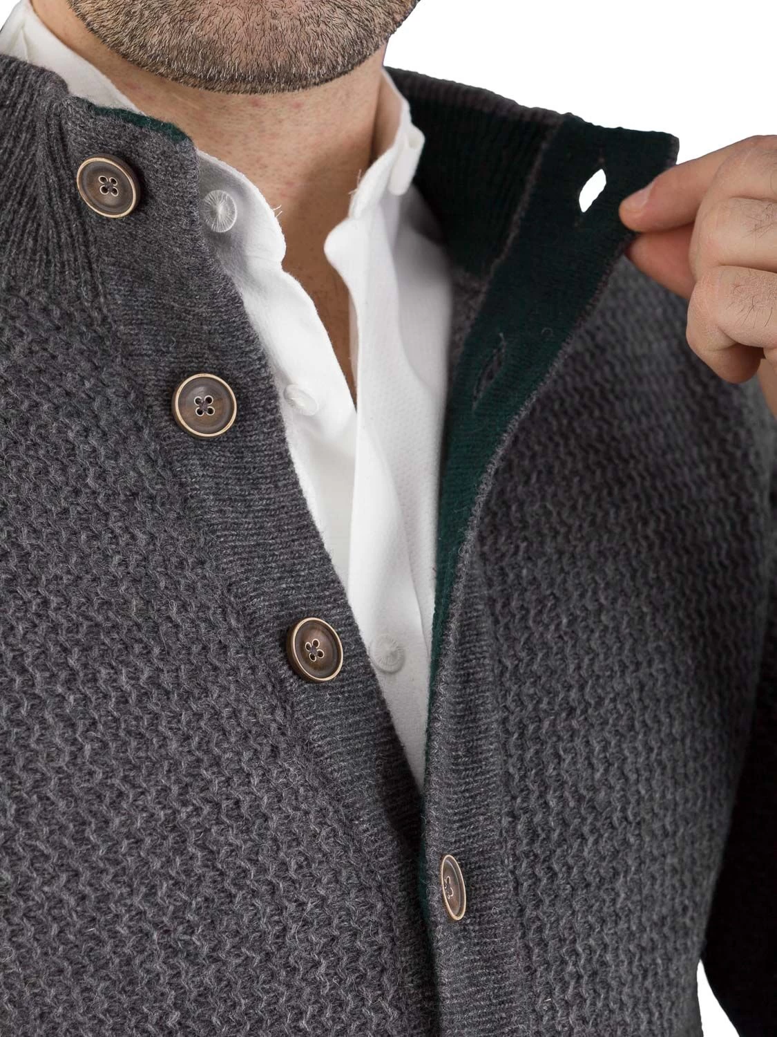 Schöne Strickjacke U9334 grau der Marke Gweih & Silk. Die hochwertig verarbeitete Trachtenjacke wird in Italien hergestellt. Der schöne hohe Stehkragen ist innen tannengrün ausgearbeitet. Ebenso in tannengrün ist die Knopf- und Knopflochleiste innen farblich abgesetzt. Die Jacke wird mit schönen Usedknöpfen geknöpft. Die Trachtenstrickjacke ist schön schmal geschnitten, und macht daher eine sehr gute Figur
