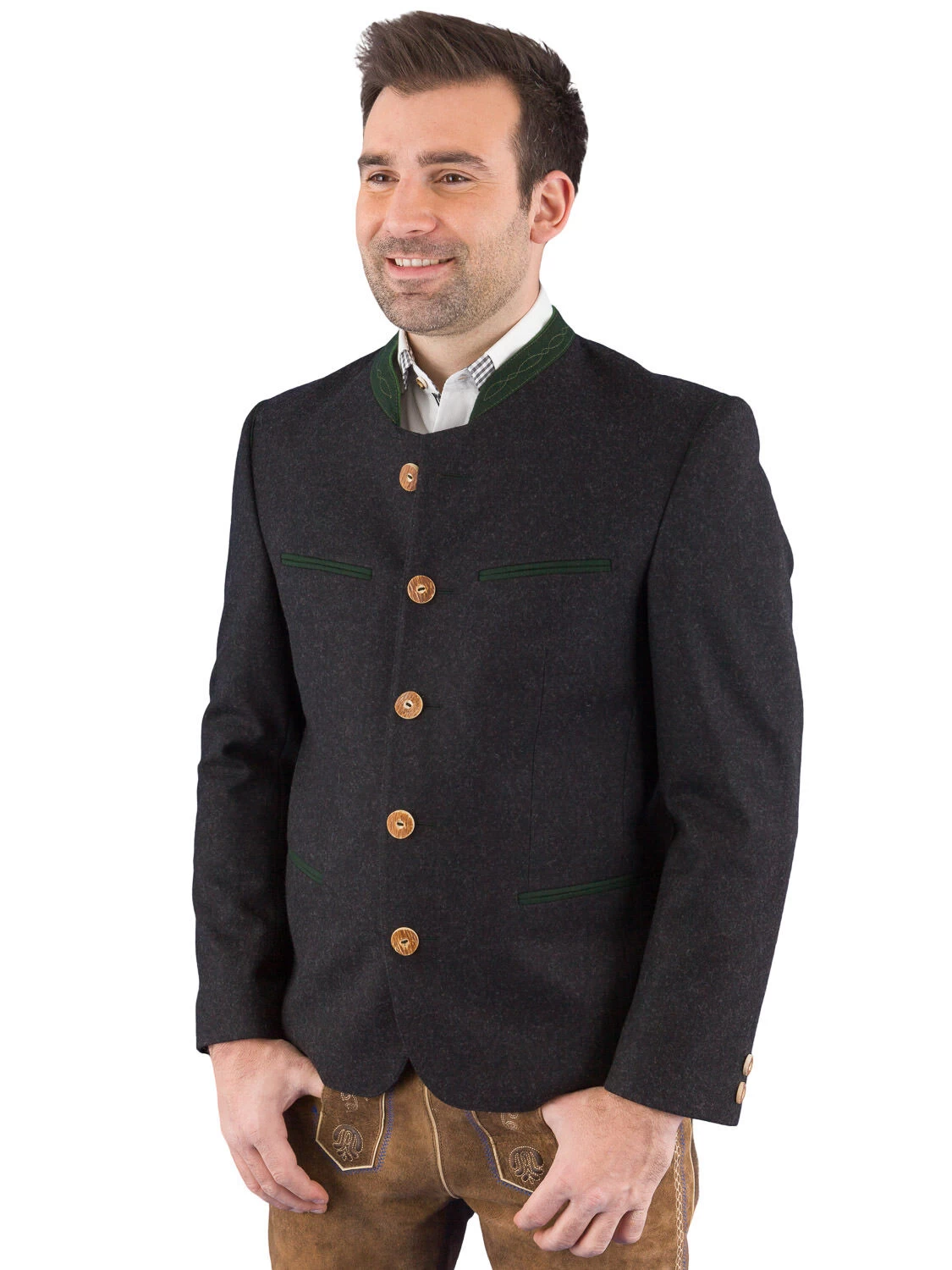 Trachtenjacke Pichl X anthrazit der Marke Rofan Tracht. Die Joppe ist aus leichten Sommerloden gefertigt. Kragen und Taschen Paspele sind aus grünen Loden gearbeitet. Am 67 cm langen Rücken kann eine Springfalte aufgetrennt werden. Man kann den Rücken aber auch zugenäht lassen. Die Lodenjacke ist mit 3 Innentaschen ausgestattet.