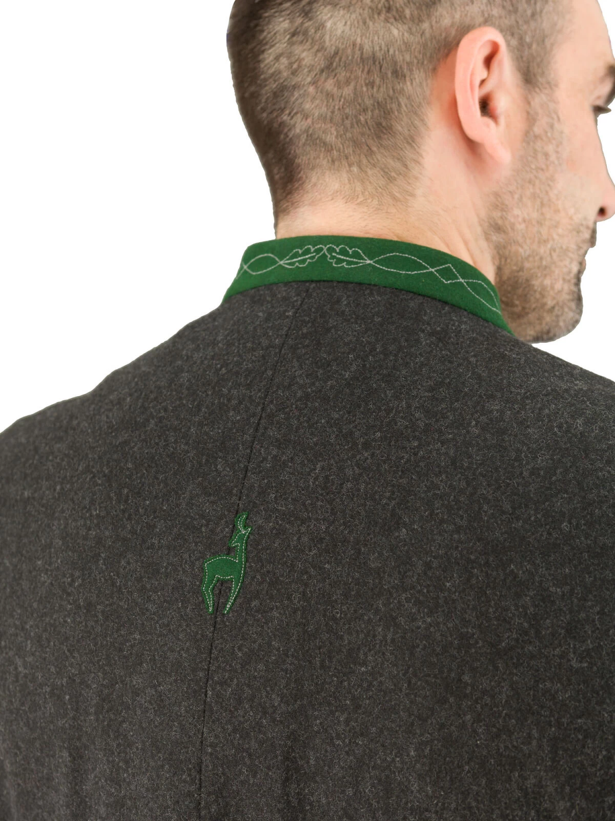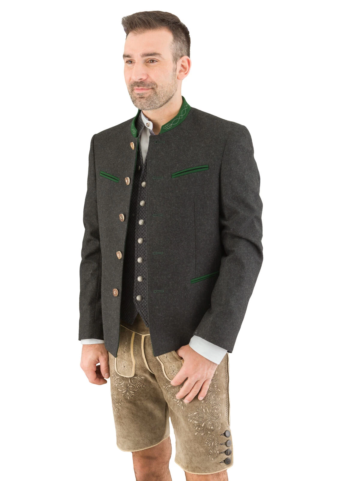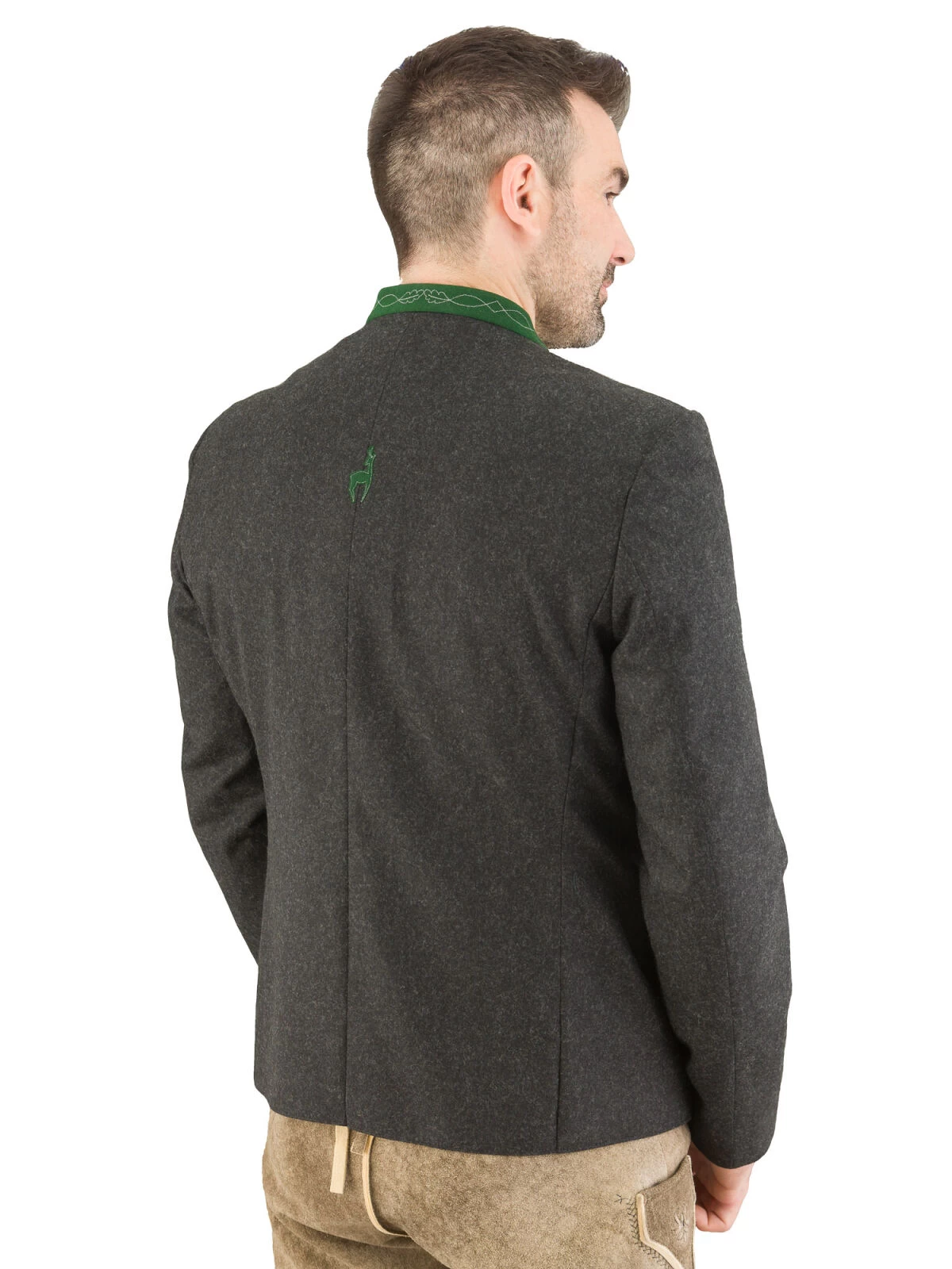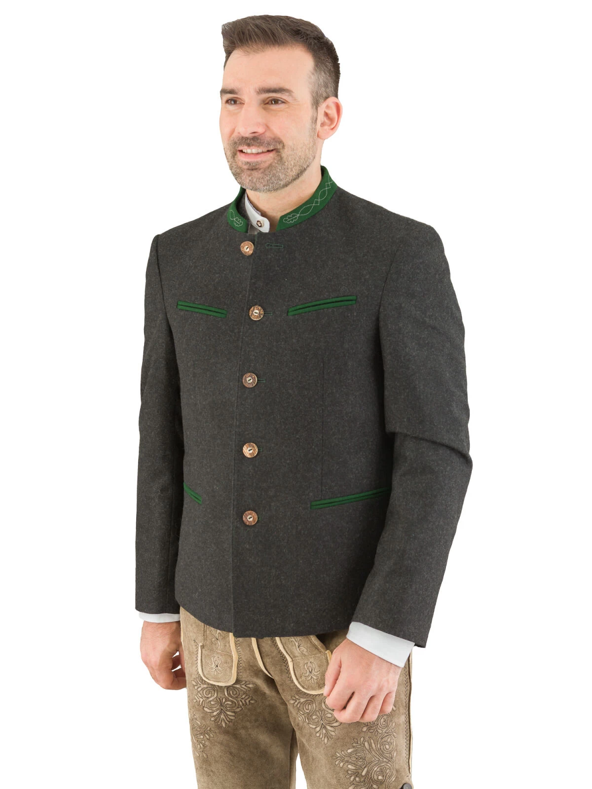 Hochwertiges Trachten-Sakko Modell Pankratz vom Markenhersteller Grasegger. Die Lodenjacke in anthrazit ist aus 100% Schurwolle gefertigt. Der grasgrüne Kontrast Stehkragen ist 2,4 cm hoche und bestickt. Die 4 Paspel Taschen sind ebenfalls mit dem grünem Kontrastloden ausgearbeitet. Das Einreiher-Sakko wird mit echten Hirschhornknöpfen geschlossen. Die teilgefütterte Trachtenjacke ist mit 3 Innentaschen, davon sind 2 mit einem Knopf geschlossen, ausgestattet.Der Rücken ist mit einer offenen Falte versehen. Diese ist noch zugenäht. Wenn Sie nicht aufgetrennt wird, dann bleibt der Rücken glatt. Mit dieser klassischen Trachtenjacke sind Sie sowohl zur Lederhose als auch zur Jeans oder Stoffhose immer bestens gekleidet.