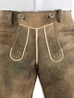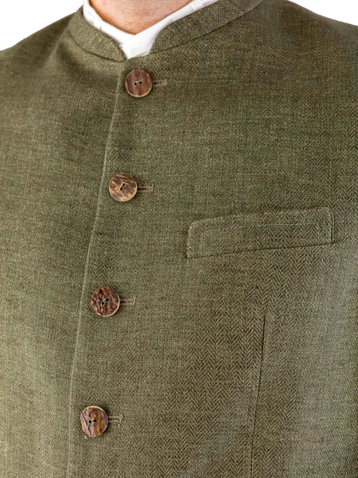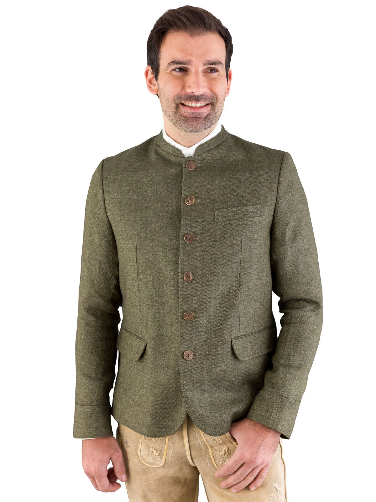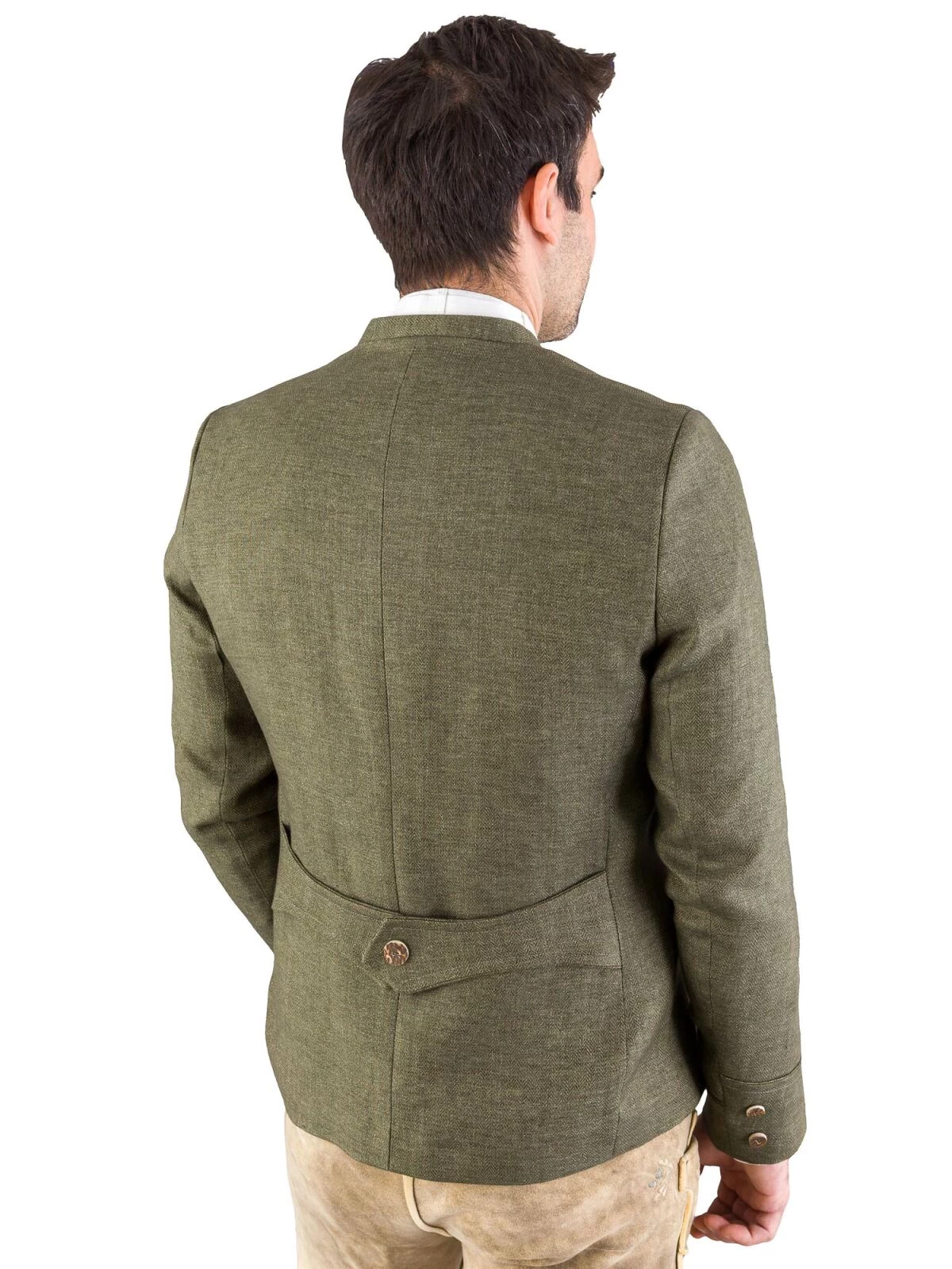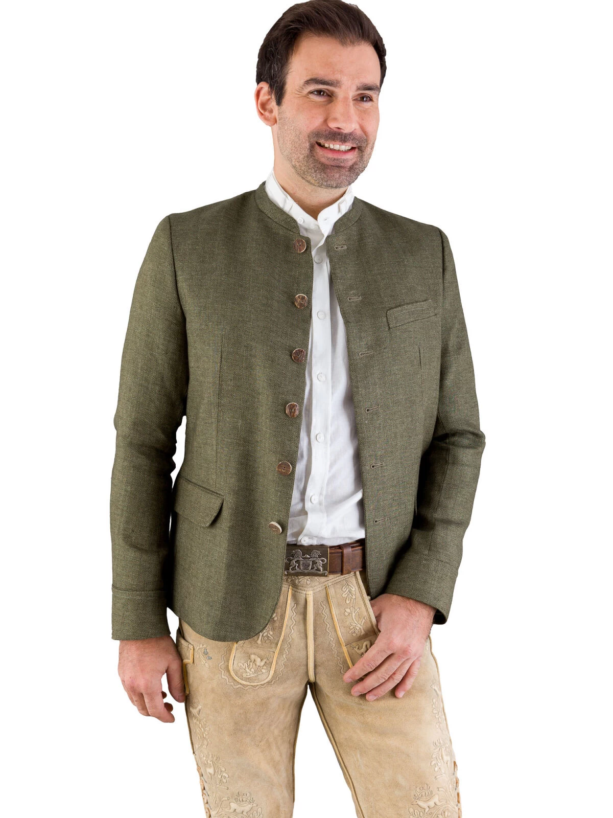 Hochwertiges Trachtensakko vom Markenlabel Gottseidank in der aktuellen Farbe oliv. Die Jacke ist aus hochwertigen Fischgrätleinen, das in Italien gewebt wurde. Der glatte Rücken ist mit einem Riegel versehen. Die echten Hirschhornknöpfe zieren die hochgeschlossene Trachtenjacke. Der Einreiher im Slim Fit Schnitt ist mit 2 Leistentaschen mit Patten und einer Brusttasche ausgestattet. Das Sakko ist grün gestreift voll gefüttert und mit 3 Innentaschen versehen. Ob zur Lederhose oder auch modisch kombiniert, werden Sie die Jacke gerne tragen und sich sehr wohl darin fühlen.