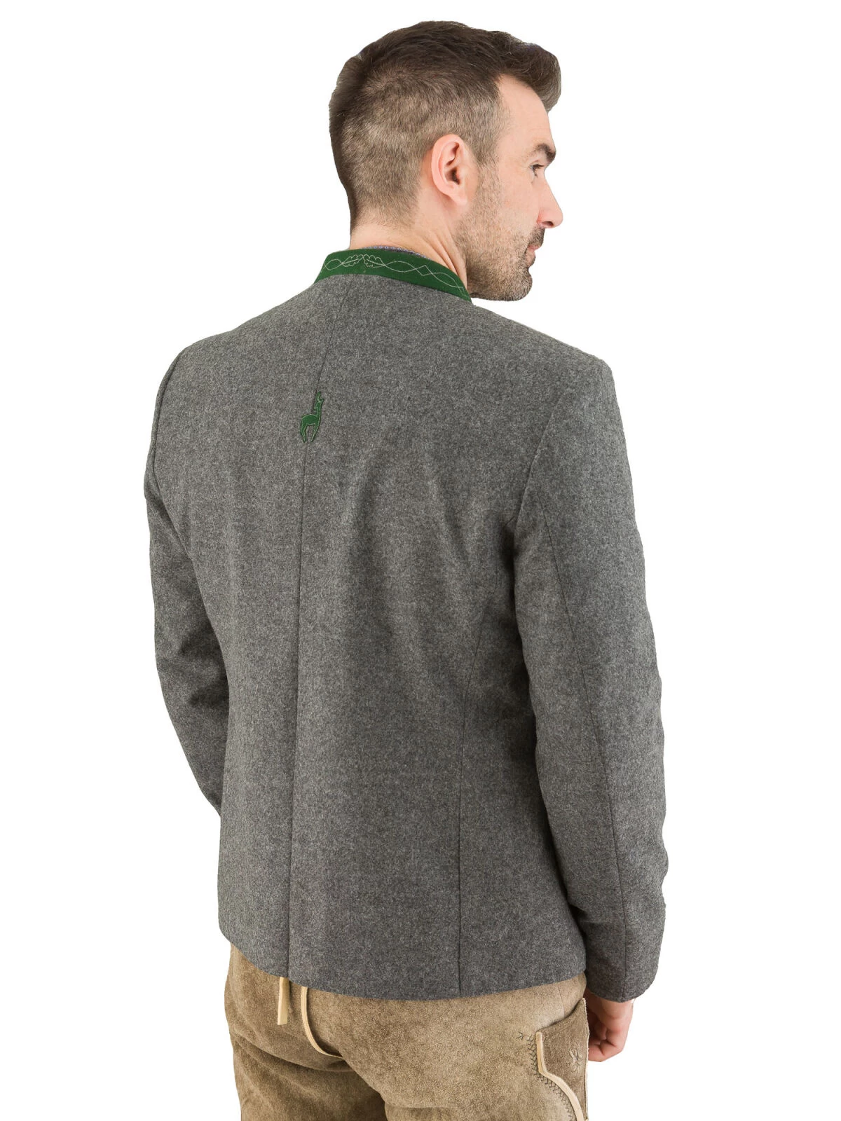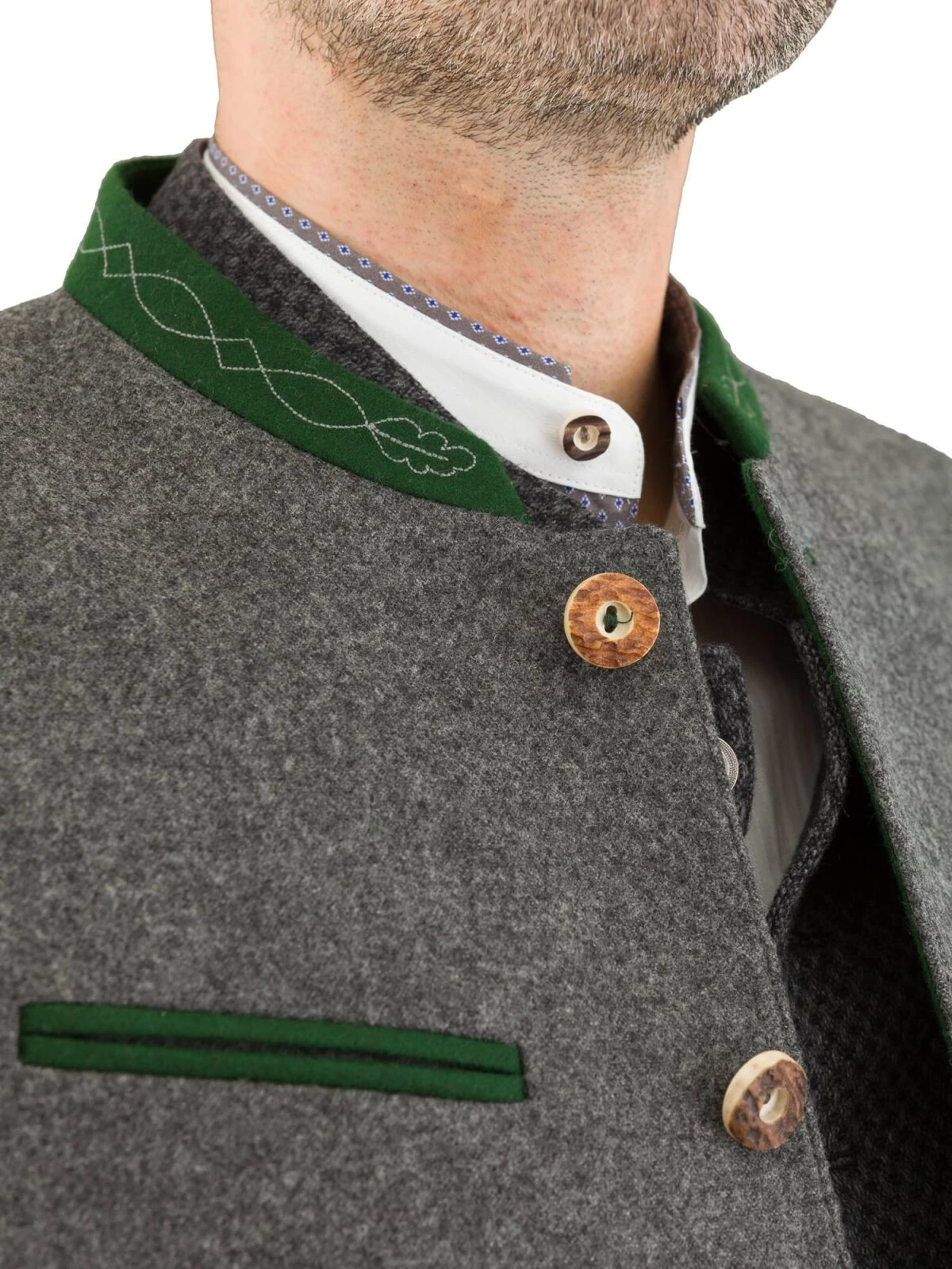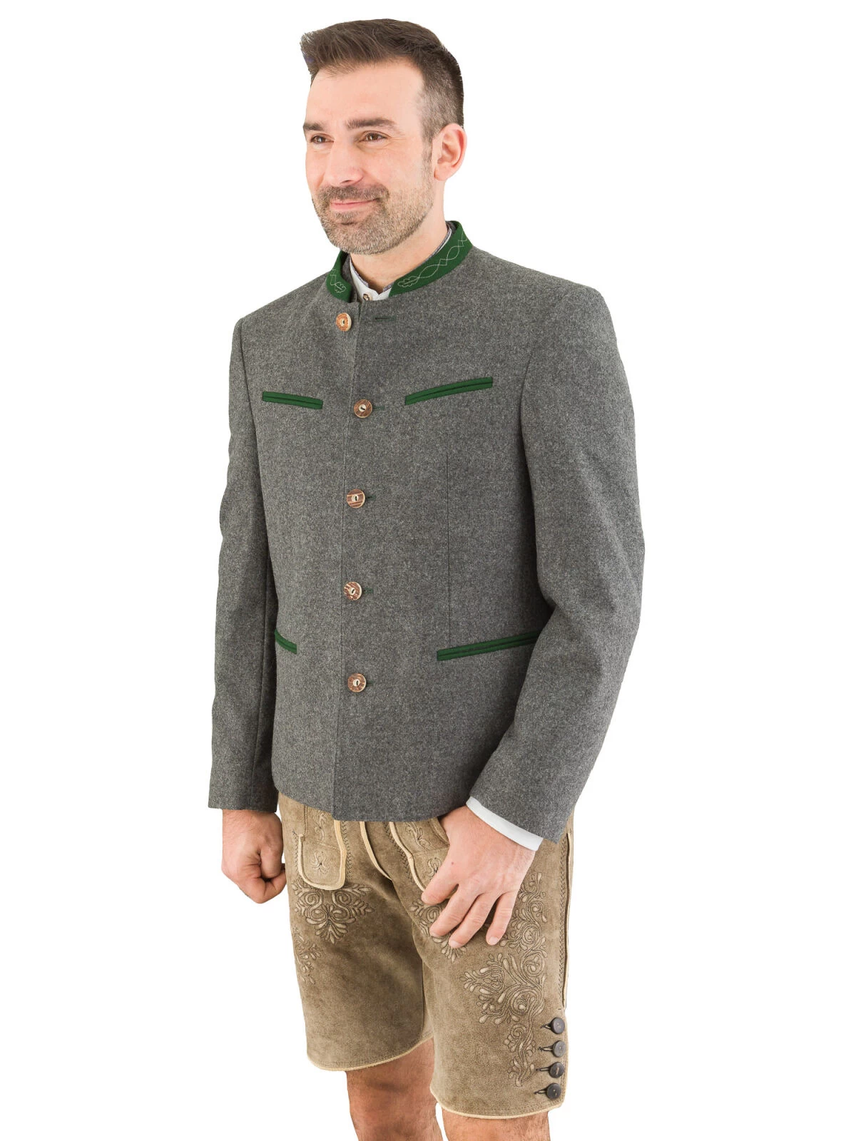 Hochwertiges Trachten-Sakko Modell Pankratz vom Markenhersteller Grasegger. Die graue Lodenjacke ist aus 100% Schurwolle gefertigt. Der grasgrüne Kontrast Stehkragen ist 2,4 cm hoche und bestickt. Die 4 Paspel Taschen sind ebenfalls mit dem grünem Kontrastloden ausgearbeitet. Das Einreiher-Sakko wird mit echten Hirschhornknöpfen geschlossen. Die teilgefütterte Trachtenjacke ist mit 3 Innentaschen, davon sind 2 mit einem Knopf geschlossen, ausgestattet.Der Rücken ist mit einer offenen Falte versehen. Diese ist noch zugenäht. Wenn Sie nicht aufgetrennt wird, dann bleibt der Rücken glatt. Mit dieser klassischen Trachtenjacke sind Sie sowohl zur Lederhose als auch zur Jeans oder Stoffhose immer bestens gekleidet.