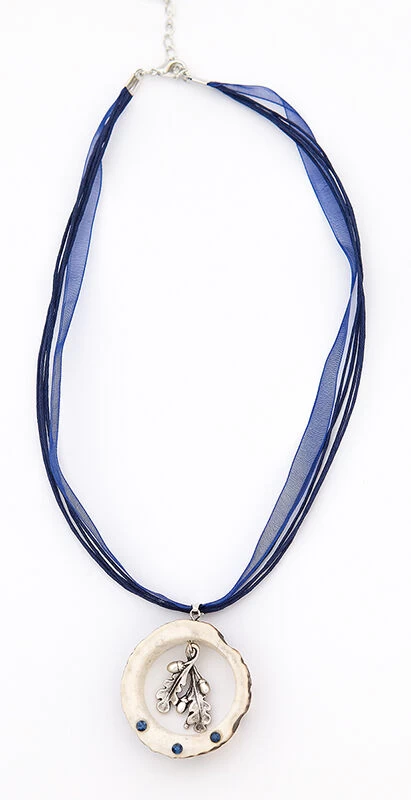 Schöne Trachtenkette 109 in marine der Marke Lusana Made in Austria. Im echtem Rehring hängt ein versilbertes Eichenlaub. Am Rehring sind 3 marineblaue Kristalle eingearbeitet. Der Anhänger hängt an einem marineblauen BW Organza Halsband. Das Metall der Kette ist nickelfrei.