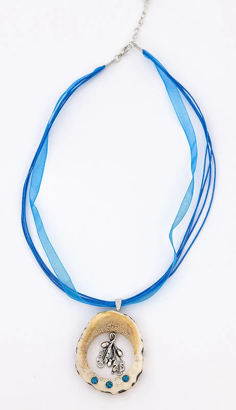 Schöne Trachtenkette 109 in türkis der Marke Lusana Made in Austria. Im echtem Rehring hängt ein versilbertes Eichenlaub. Am Rehring sind 3 türkisblaue Kristalle eingearbeitet. Der Anhänger hängt an einem türkisblauen BW Organza Halsband. Das Metall der Kette ist nickelfrei.