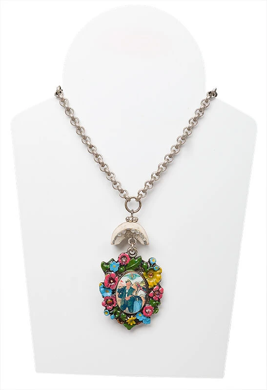 Wunderschöne Trachtenkette Nostalgie. Der schöne Anhänger mit einem Nostalgischen Trachtenpärchen ist eingerahmt mit bunten Bergblumen in rosa, blau, gelb und grün. Über den schönen Anhänger ist ein echtes Hirschhorn mit Kristallen verziert. Mit dieser schönen Kette ziehen Sie bestimmt die Blicke auf sich.