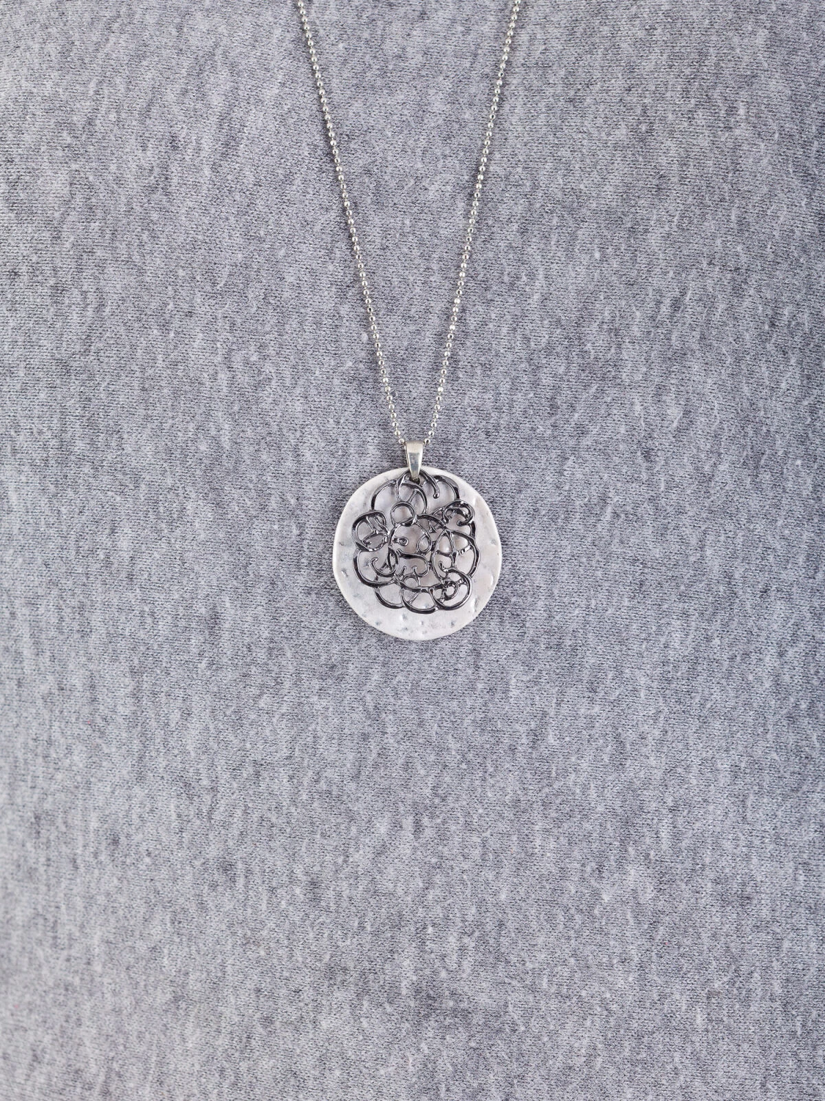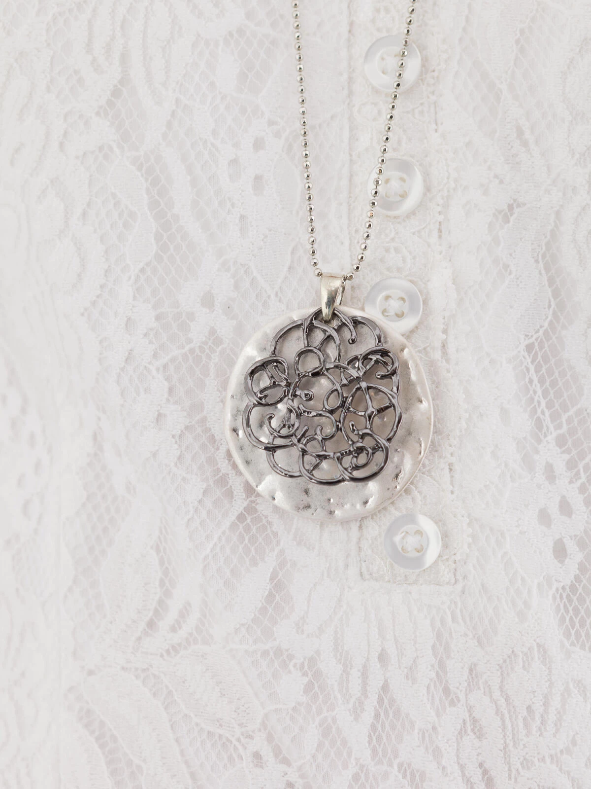 Unser Trachtenschmuck Collier Ornament ist das perfekte Accessoire für alle Liebhaberinnen von traditionellem Design. Die Kette besteht aus Altsilber und ist mit einer gehämmerten Platte versehen, die das Collier zu einem echten Hingucker macht. Mit einer Länge von ca. 80 cm ist die Kette ideal für Trachtenoutfits aber auch als stilvolles Statement-Piece für den Alltag geeignet.