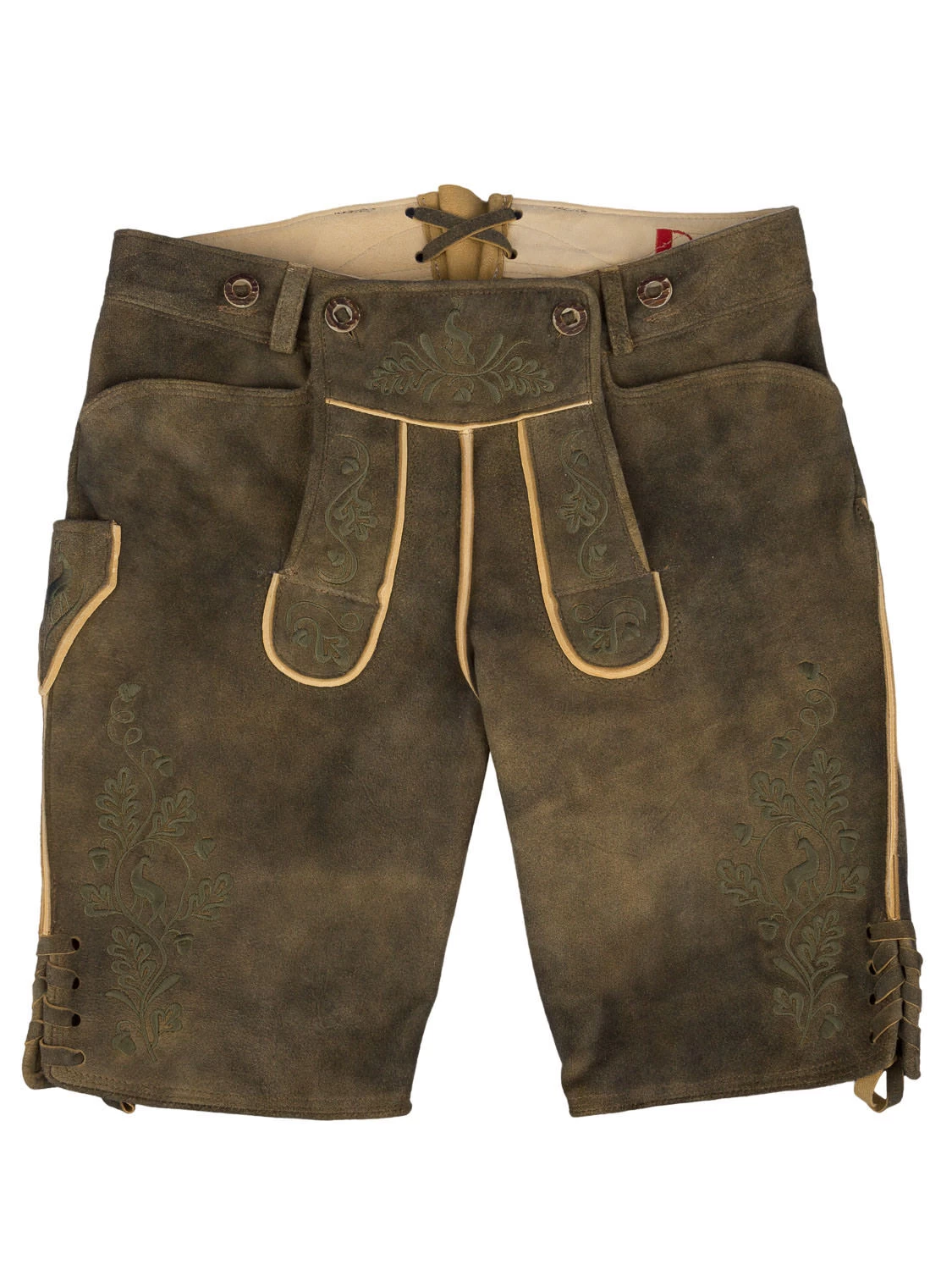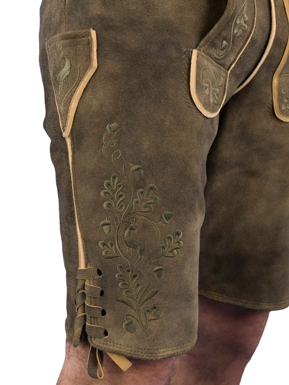 Hochwertig verarbeitete kurze Lederhose Bertl ZV oliv der Marke Ostarichi. Die kernige, weiche Lederhose hat eine sehr gute Passform. Sie ist blattbestickt und seitlich mit Lederbänder geschnürt. Am 4 cm breiten Bund sind Gürtelschlaufen angebracht. Rechts hinten ist eine Gesäßtasche eingearbeitet. Am Bund hinten ist ein Riegel eingearbeitet, um die Bundweite zu regulierten. Bei Gr. 46 beträgt die seitliche Länge 50 cm mit Bund.