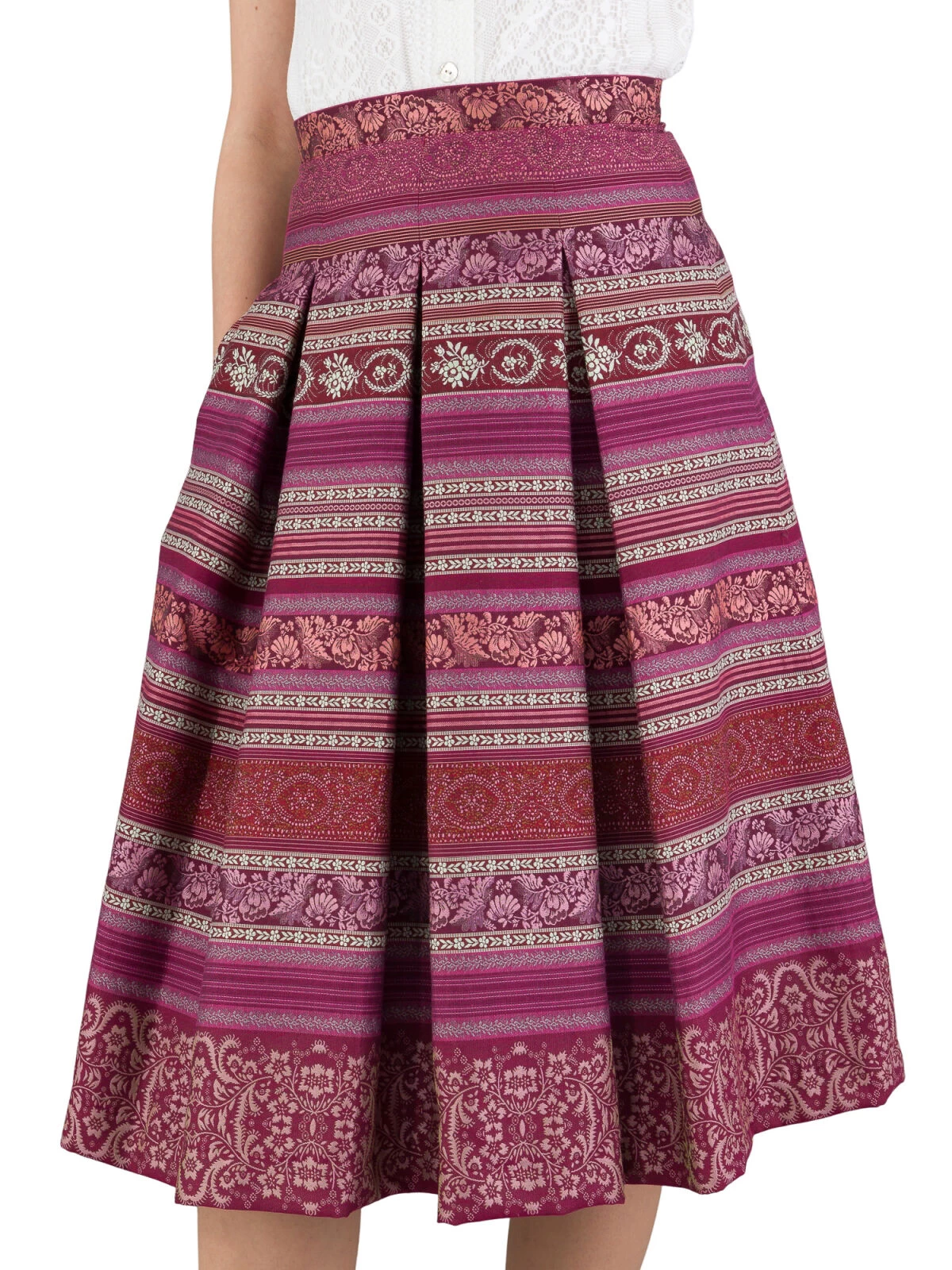 Das besondere Highlight dieses 70 cm langen Trachtenrocks sind die figurfreundlichen Kellerfalten, die auf 8 cm gesteppt sind. Sie verleihen dem Rock eine schmeichelnde Silhouette und lassen Sie in jeder Situation selbstbewusst und stilvoll aussehen. Die raffinierte eingearbeitete Schubtasche auf der rechten Seite bietet Ihnen praktischen Stauraum für Ihre Habseligkeiten, ohne das Design des Rocks zu beeinträchtigen.