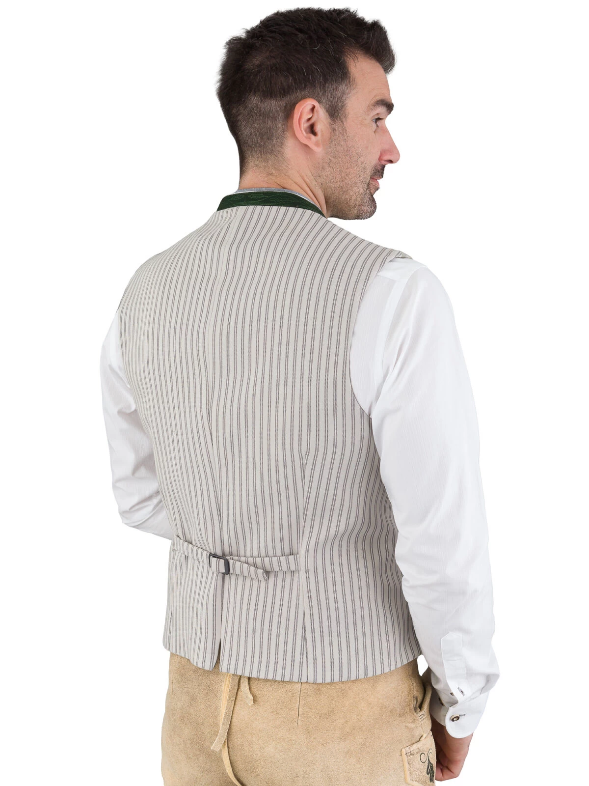 Die Trachtenweste Gottseidank Kontantin salbeigrün ist ein echter Hingucker. Der bestickte grüne 2 cm hohe Lodenkragen, die edlen Altmessingknöpfe und der schöne gestreifte Stretchrücken mit Spange machen die Weste zu einem einzigartigen und stilvollen Kleidungsstück. Zudem verfügt sie über eine Innentasche und 3 Paspel Außentaschen. Dank der hochwertigen Materialien und der sorgfältigen Verarbeitung ist die Weste sehr langlebig.