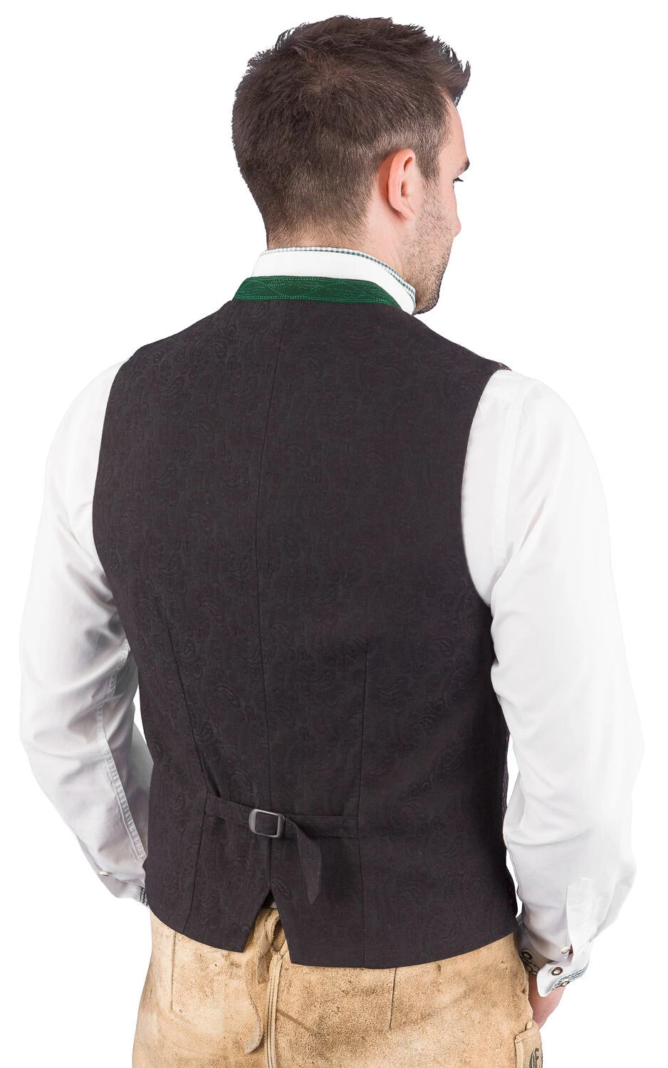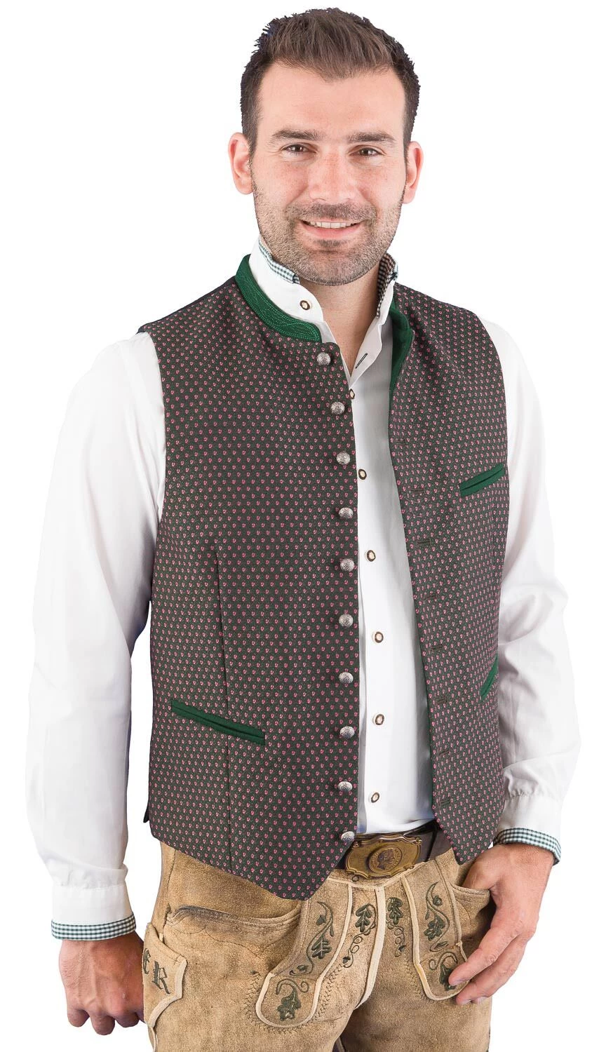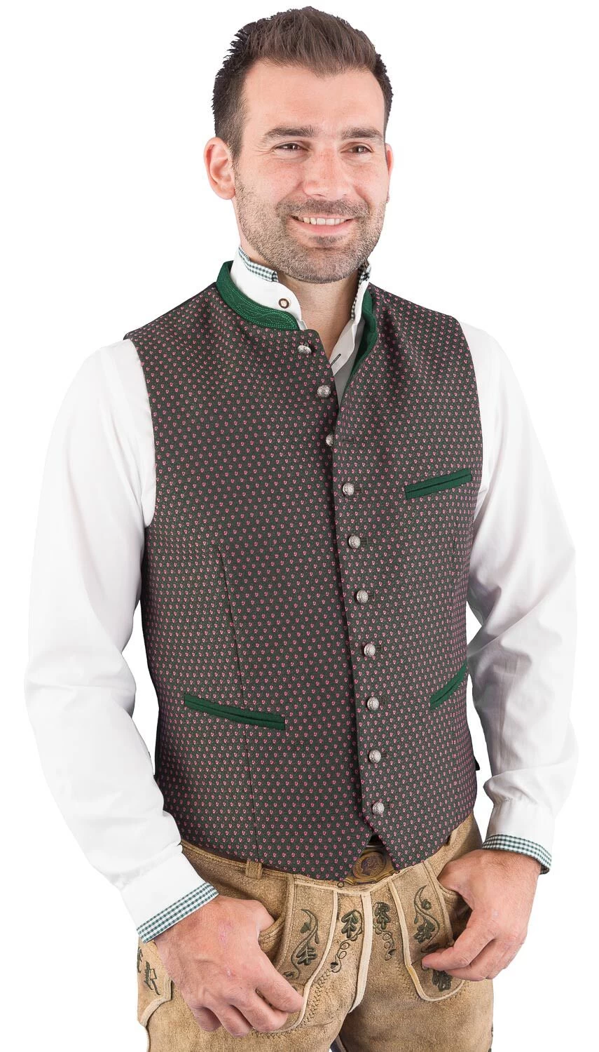 Hochwertige Trachtenweste KonstanZMA1771-1285 grün beere der Marke Gottseidank. Das Gilet ist mit einem traditionellen Stoff verarbeitet und hat einen modischen schmalen Schnitt. Der 2 cm hohe Lodenstehkragen ist Ton in Ton bestickt. Die Weste wird vorne mit schönen Altsilberknöpfen geknöpft. Der bequeme Stretchrücken ist schwarz und Ton in Ton mit einem Paisley Muster versehen. Die Rückenlänge bei Gr. 46 beträgt 58 cm.