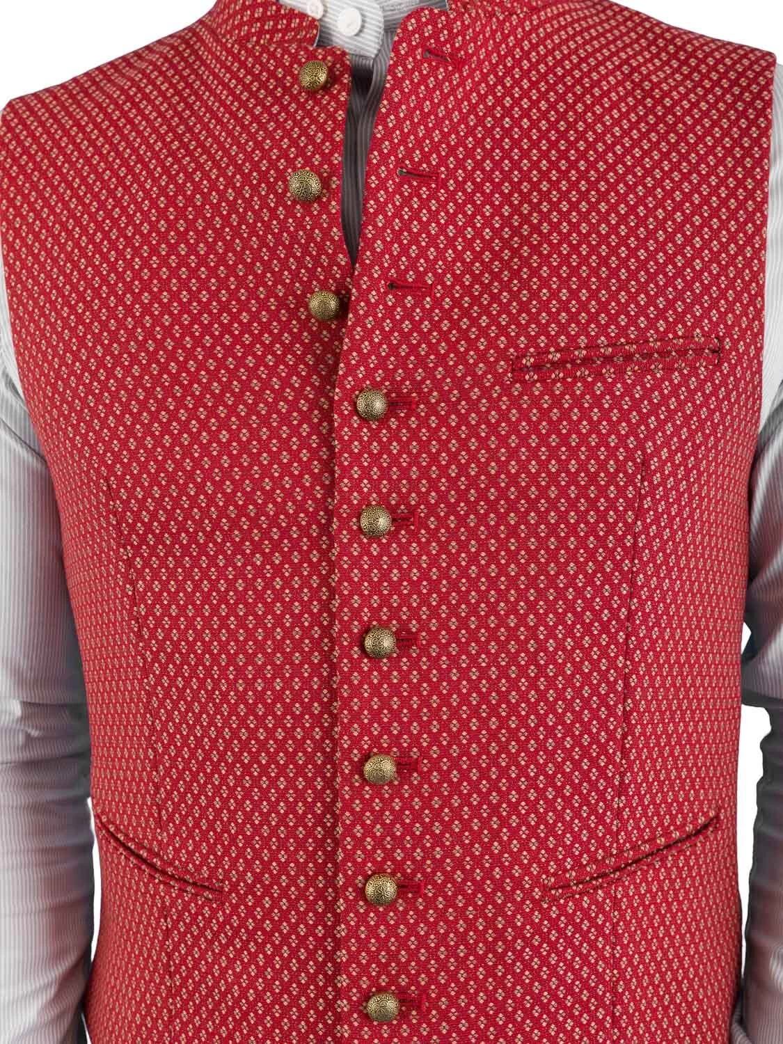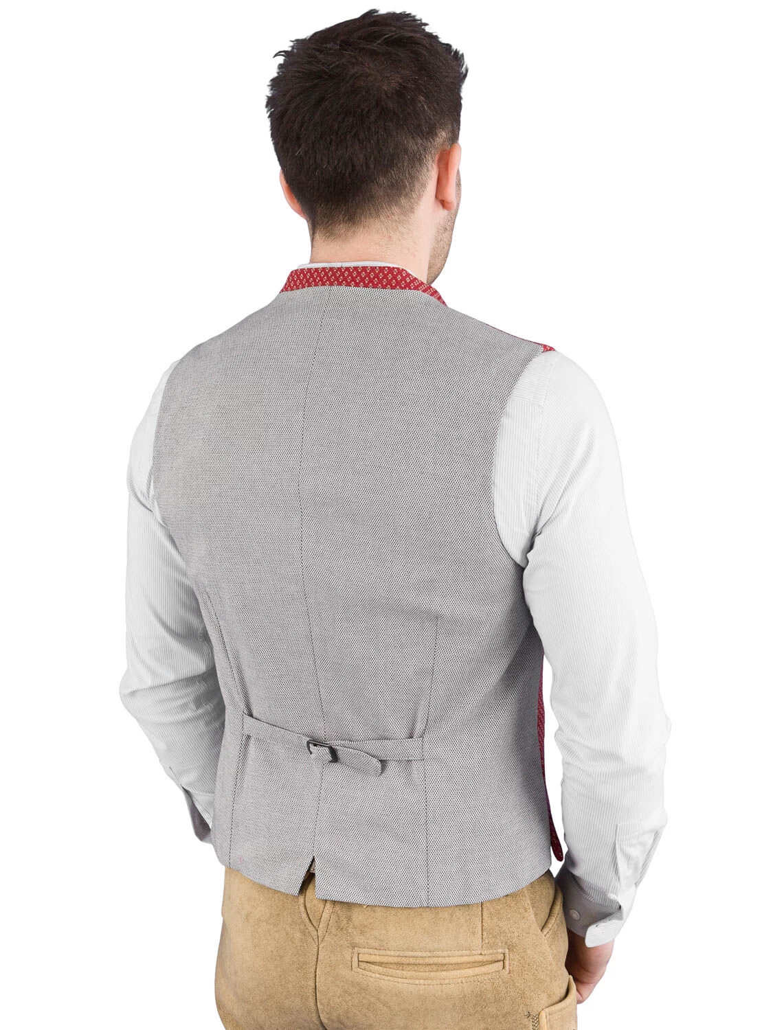 Hochwertige Trachtenweste KonstanZUG lachsfarbe der Marke Gottseidank. Die Weste in Slim Fit Schnitt ist mit Elasthan ausgerüstet, und trägt sich daher sehr bequem. Schöne Altmessing Kugelknöpfe zieren das Gilet. Links ist eine Innentasche eingearbeitet. Am schwarz silber gemusterten Stretchrücken ist eine Spange angebracht, um die Taillenweite zu regulieren.