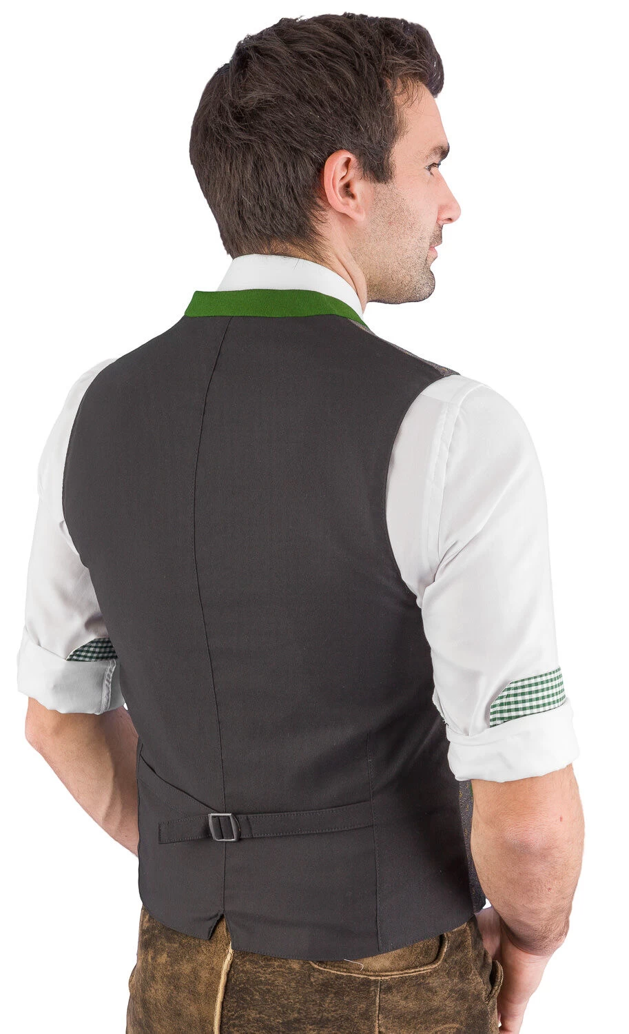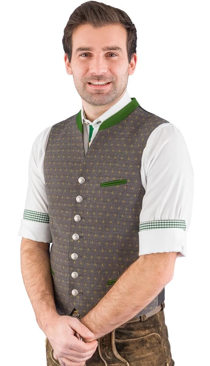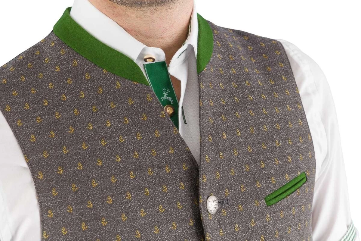 Trachtenweste Xander 16104 anthrazit 017 der Marke Grasegger. Die sehr schmal geschnittene Weste in Retro-Jacquard Musterung besticht mit dem kurzen V-Ausschnitt. Schöne Altsilberknöpfe zieren das Gilet. Rücken und Futter sind in leichter Stretchqualität. Die Taschenpaspele und der 2 cm breite Stehkragen sind aus grasgrünen Loden gefertigt. Die Weste ist sehr schmal geschnitten, im Zweifelsfall eine Nummer größer bestellen.