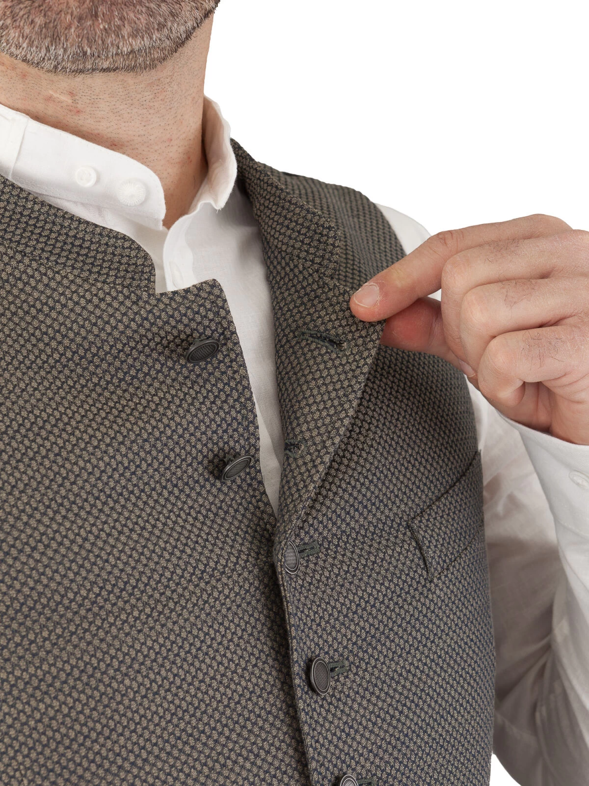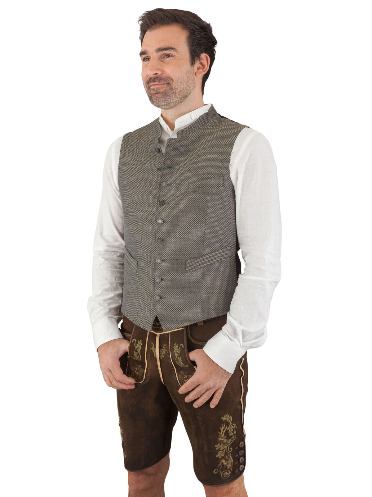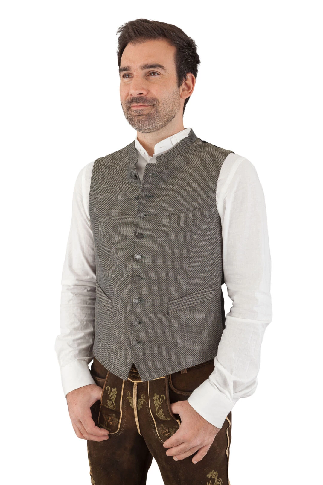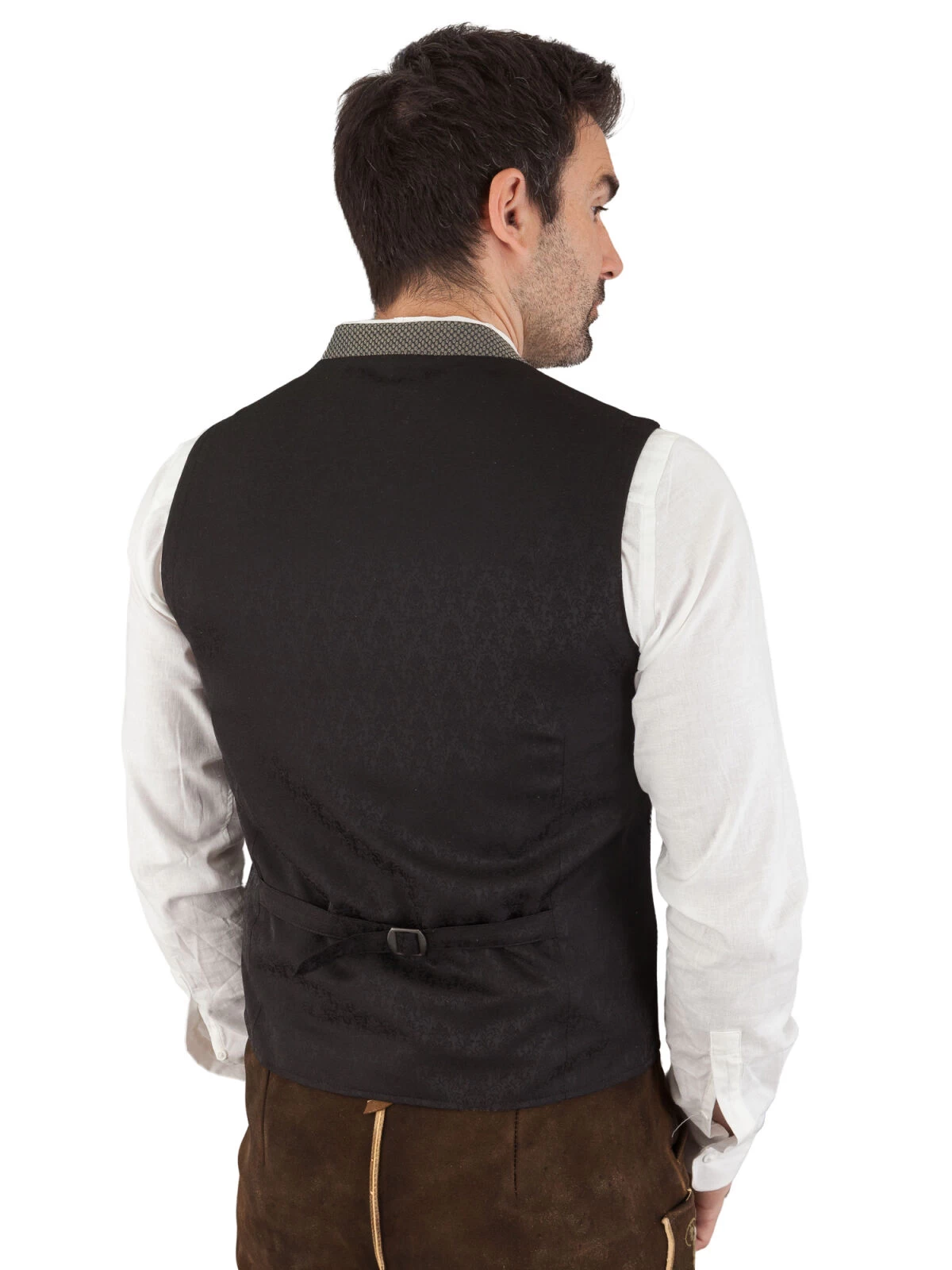 Ein Highlight der Trachtenweste sind die aufwendig gearbeiteten Knöpfe in Altsilberoptik. Sie verleihen dem Modell das gewisse Etwas und unterstreichen seinen exklusiven Charakter. Und das ist noch nicht alles: Der Rücken begeistert mit einem Ton-in-Ton Paisley-Muster, das dem Betrachter sofort ins Auge sticht.