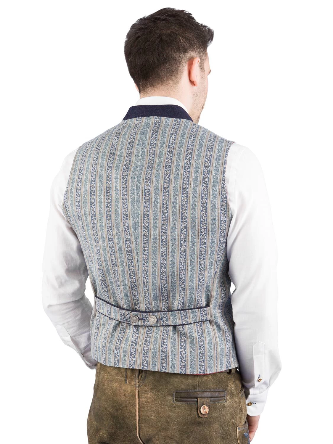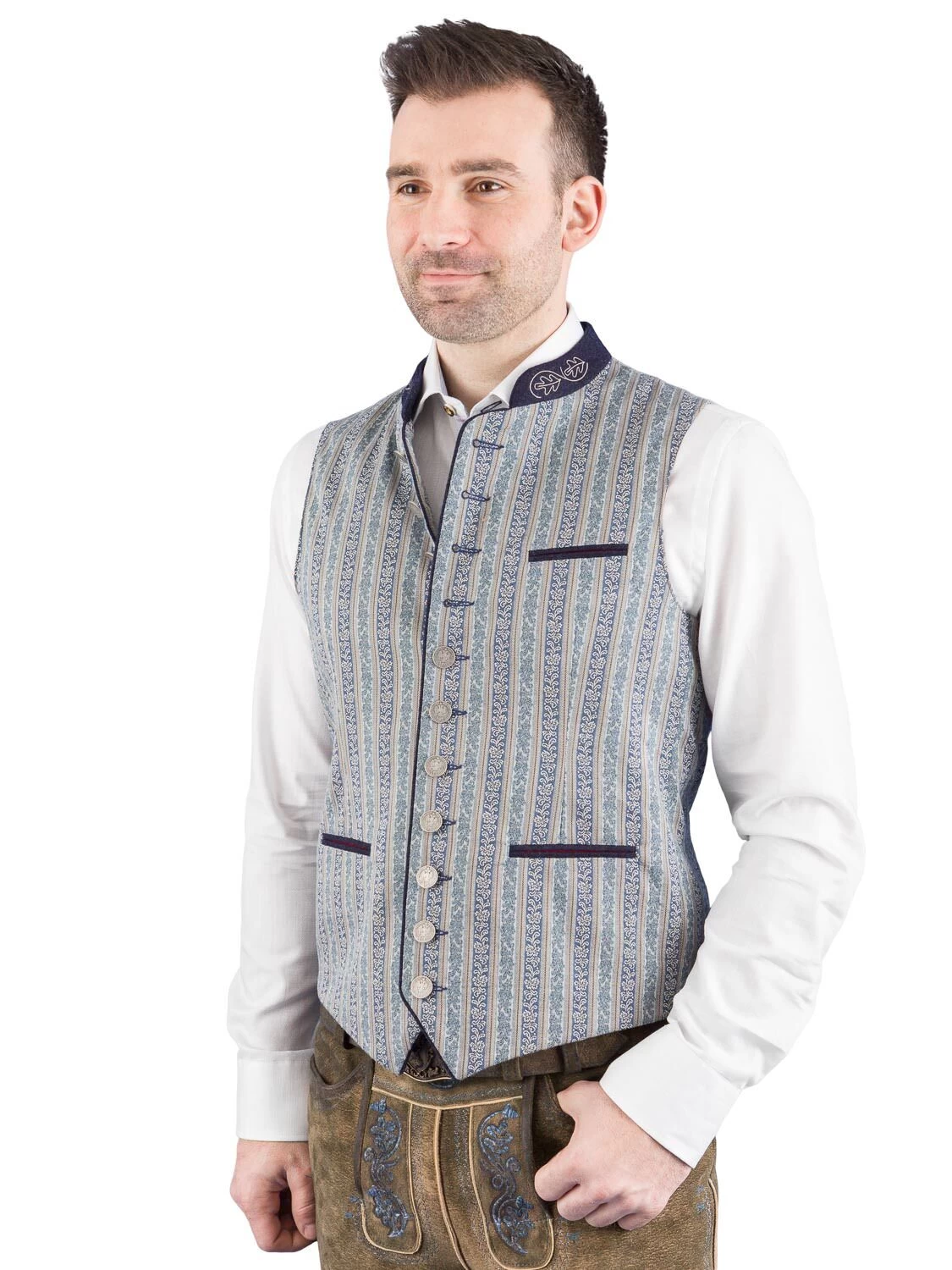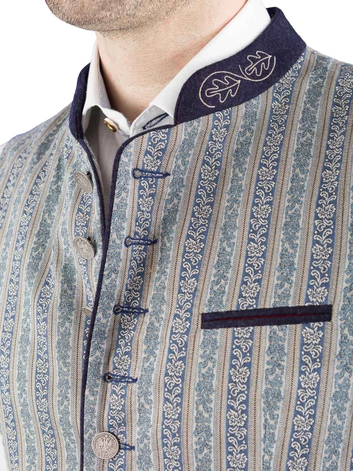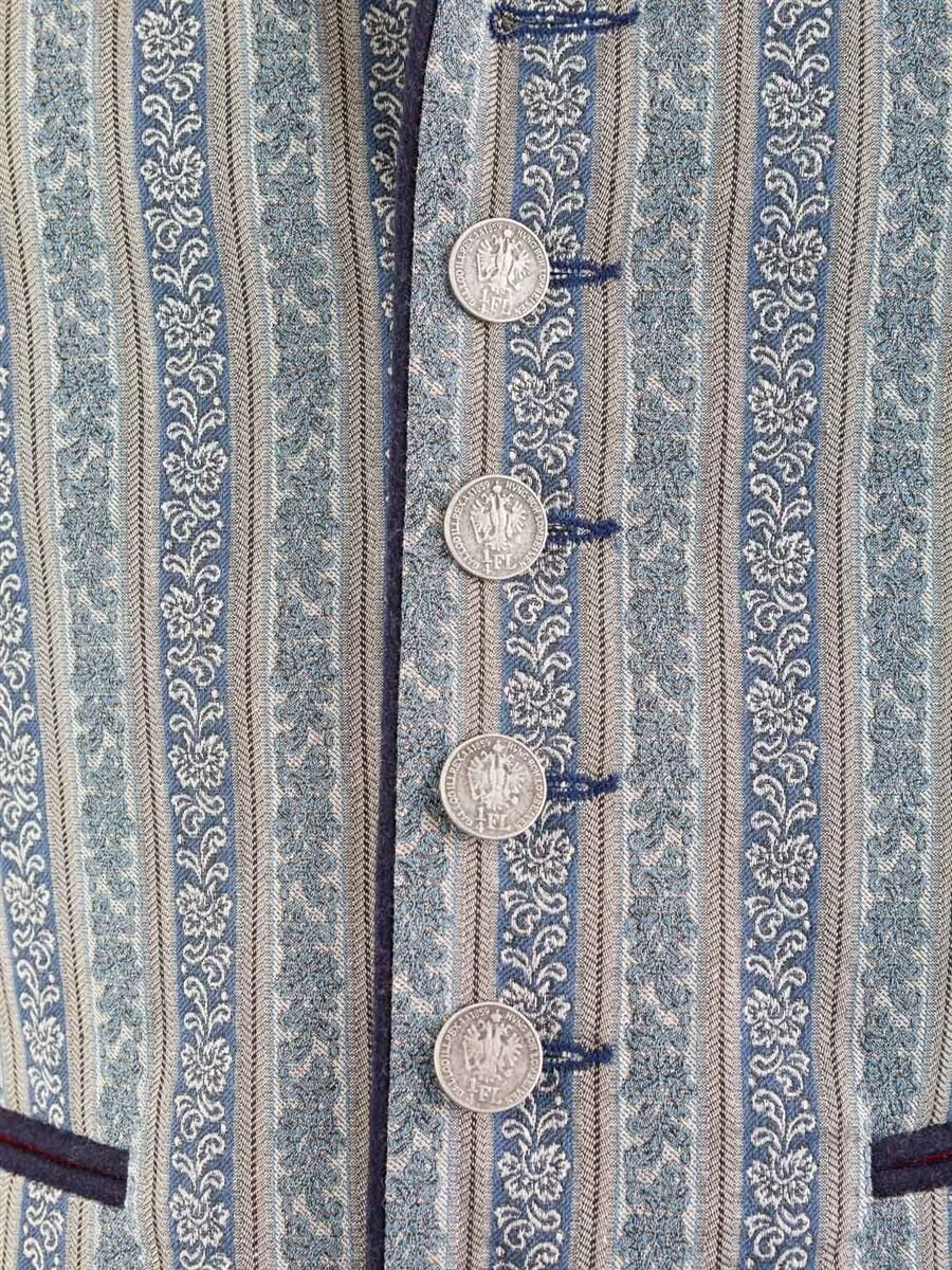 Hochwertige Trachtenweste Tobias blau der Marke Schanzer Gwand. Vorderteil und Rücken sind aus dem gleichen hochwertig blau gemusterten Stoff gefertigt. Die Paspele und der 3 cm hoche, bestickte Stehkragen sind aus blauen Loden gefertigt. Die Weste wird mit schönen altsilber Münzknöpfen geknöpft. Am Rücken ist ein mit blauen Loden unterlegter Riegel angebracht. Das Gilet ist rot gefüttert und hat links eine Innentasche eingearbeitet.