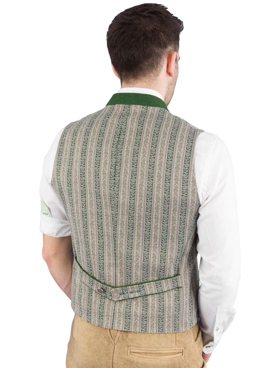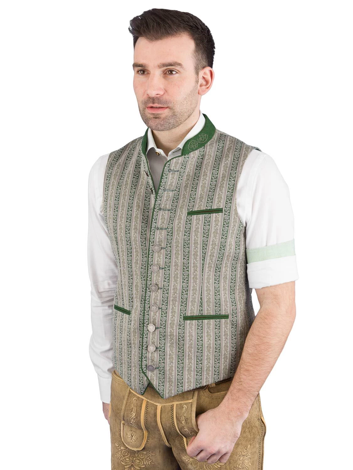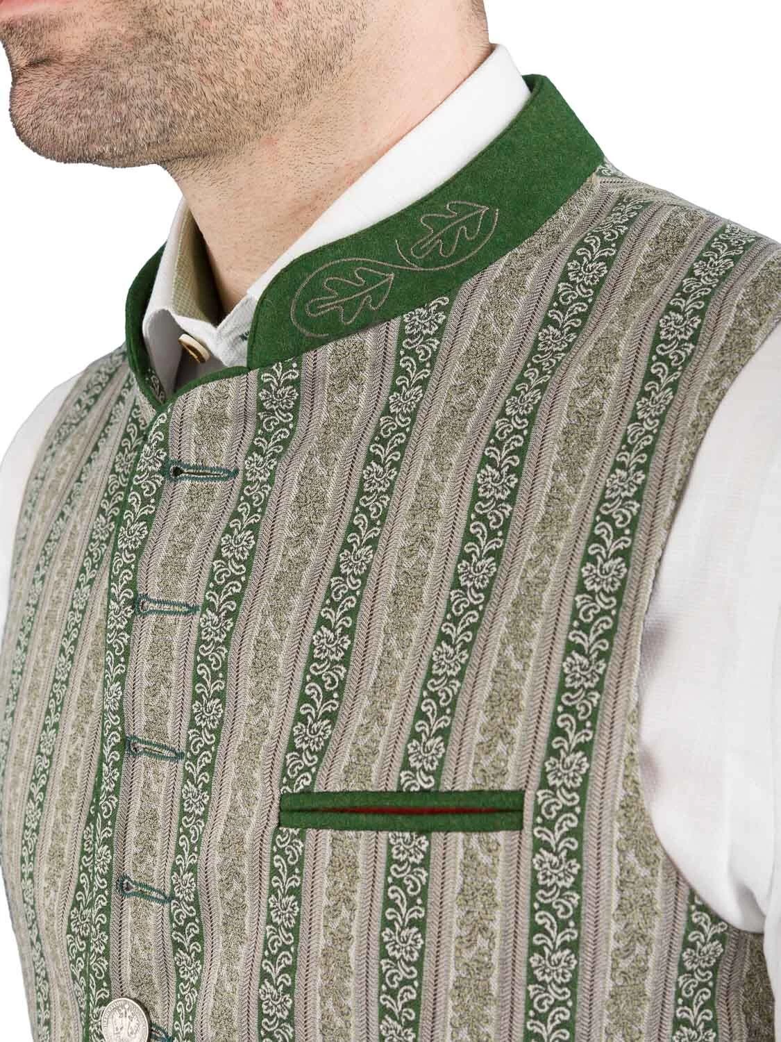 Aktuelle Trachtenweste Toias grün der Marke Schanzer Gwand. Die Weste ist hochwertig verarbeitet. Der Rücken ist aus dem selben Stoff wie das Vorderteil gefertigt. Eine Loden unterlegt Spange ziert den Rücken. Der 3 cm hohe grün melierte Stehkragen aus Loden ist mit einem Eichenlaub bestickt. Die Taschenpasele sind ebenfalls aus grünen Loden gefertigt. Die Weste ist grün gefüttert und hat links eine Innentasche eingearbeitet.